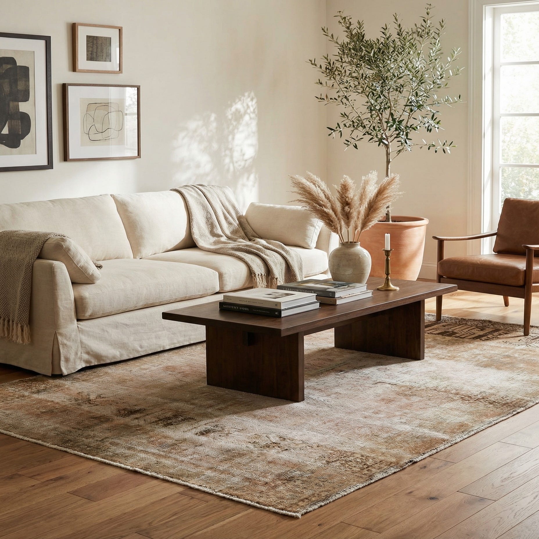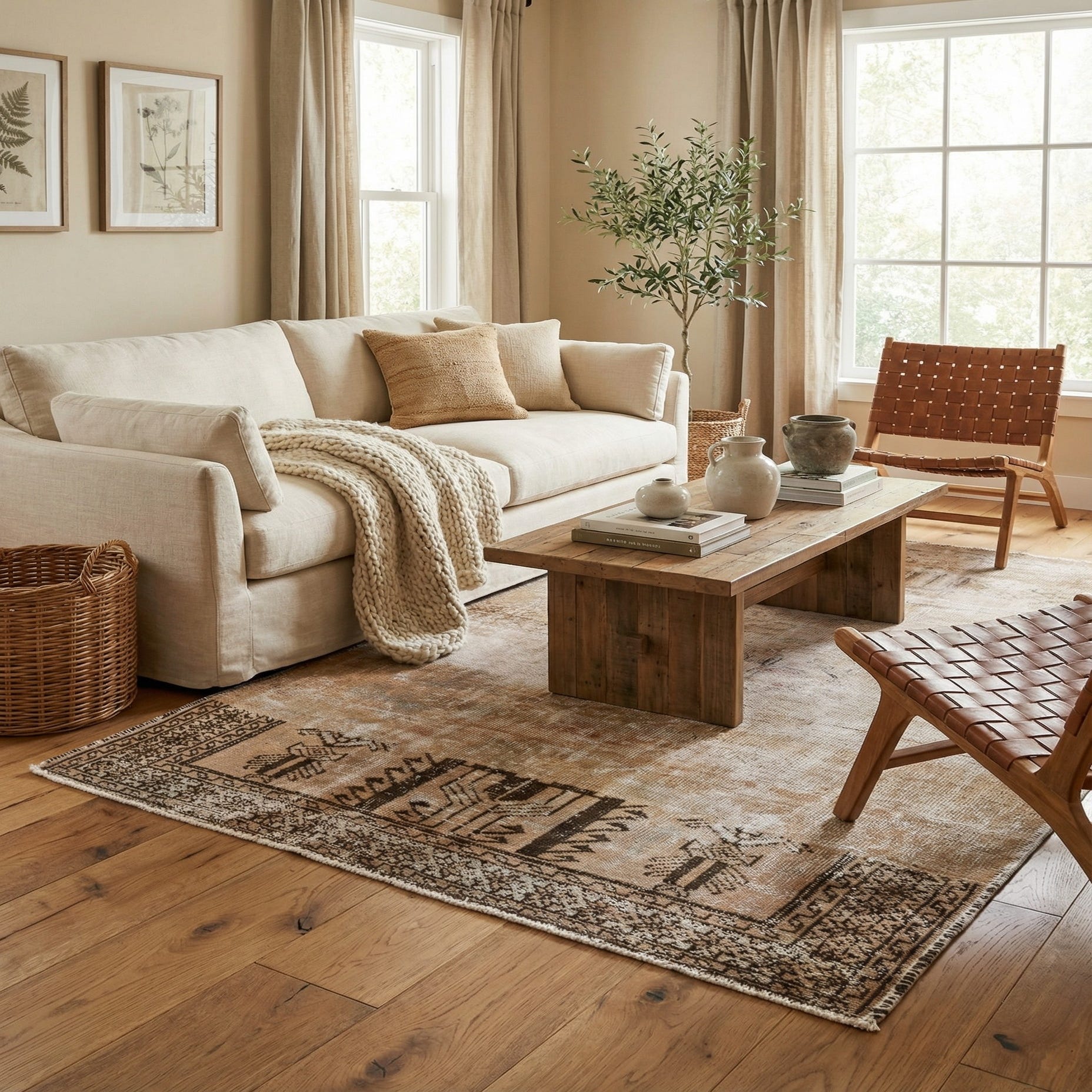 Primary color is Light Brown. Colors in this rug include: Light Brown, Brown, Rust Red, Ivory.