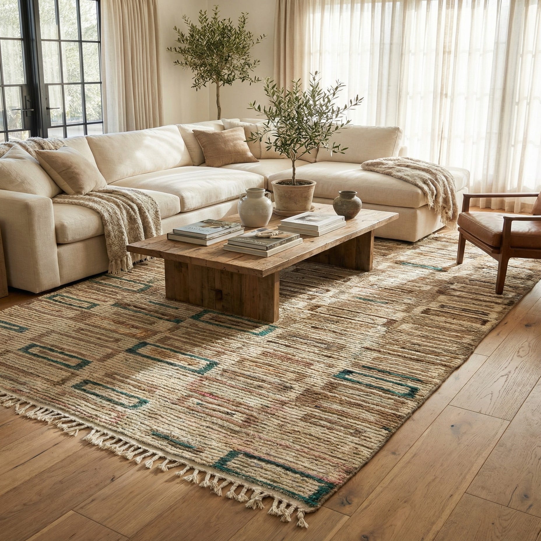 Primary color is Light Brown. Colors in this rug include: Light Brown, Beige, Brown, Green, Tan.