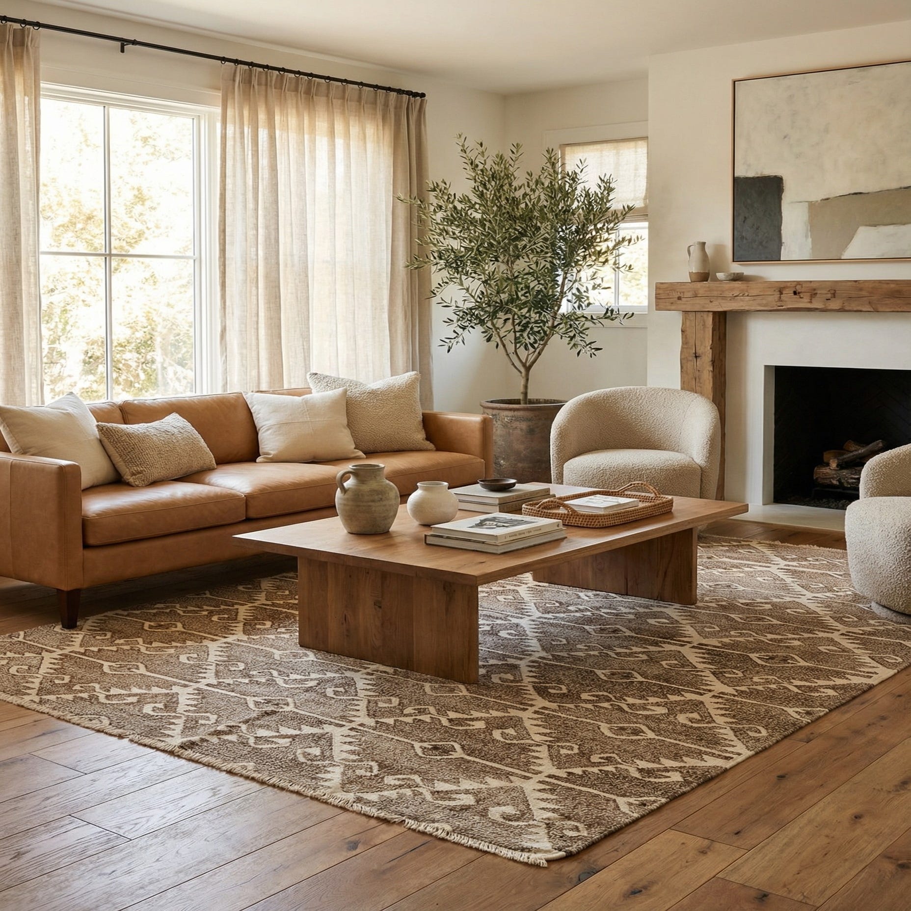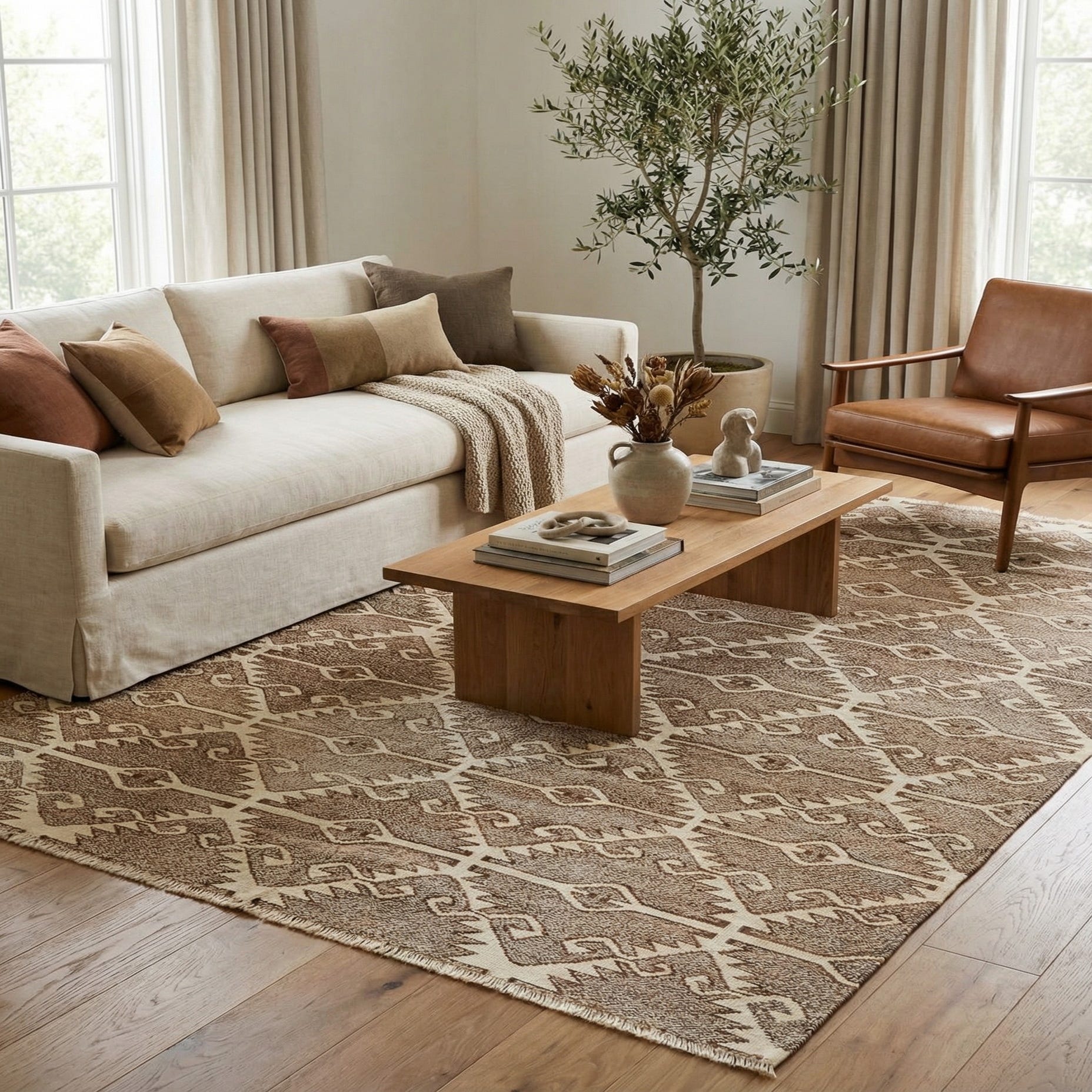 Primary color is Light Brown. Colors in this rug include: Light Brown, Ivory.