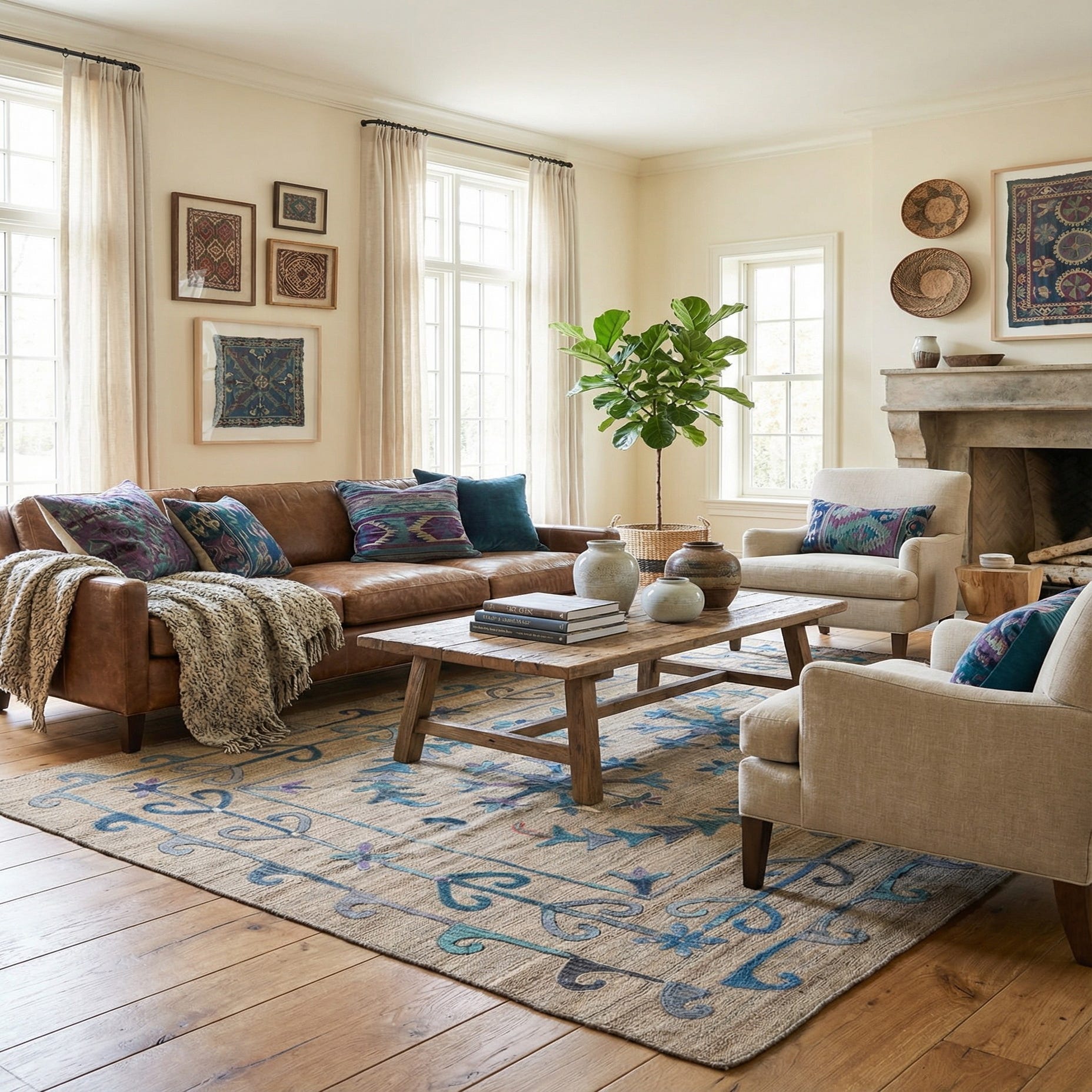 Primary color is Light Brown. Colors in this rug include: Light Brown, Blue, Brown, Turquoise, Violet, Gray.
