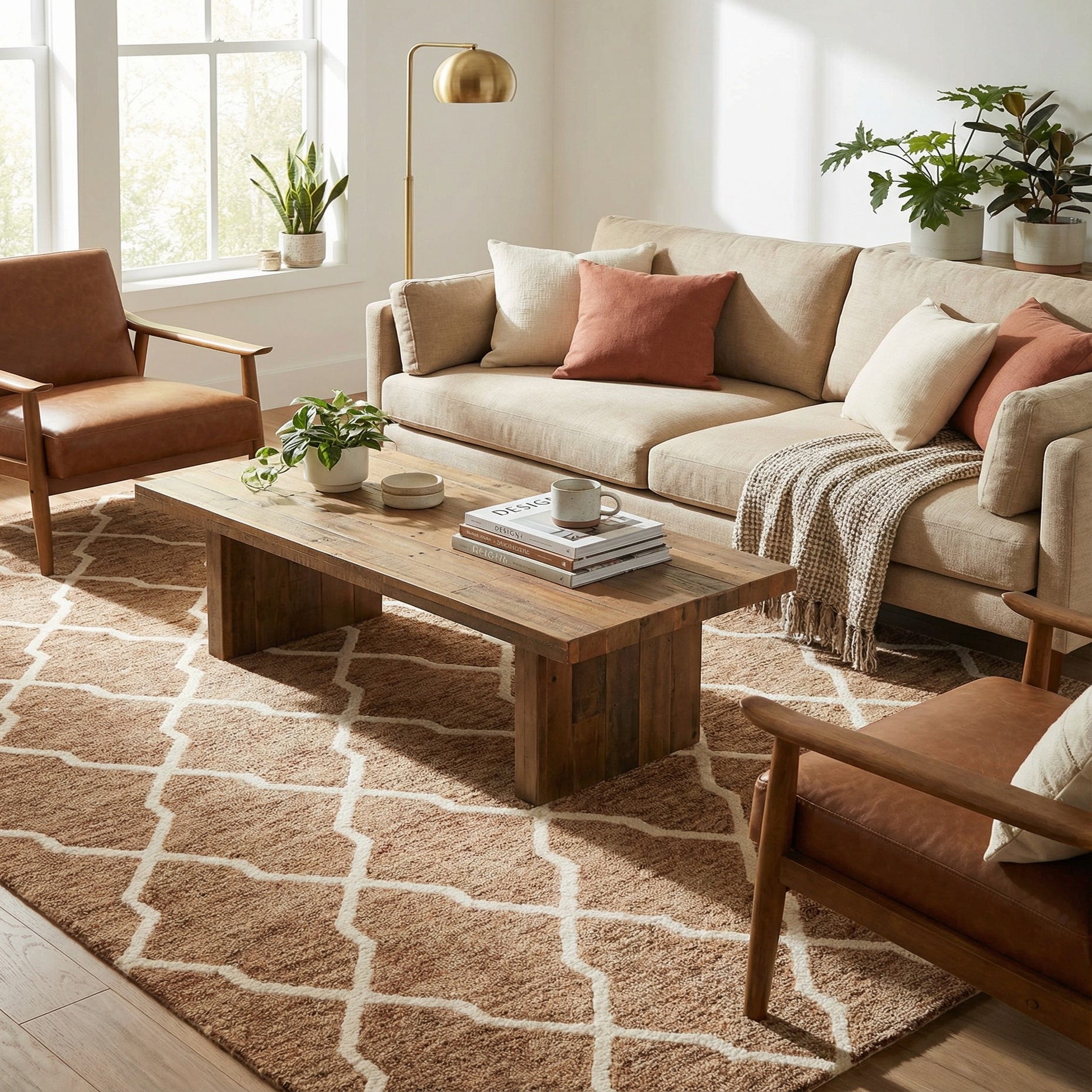 Primary color is Light Brown. Colors in this rug include: Light Brown, Ivory.