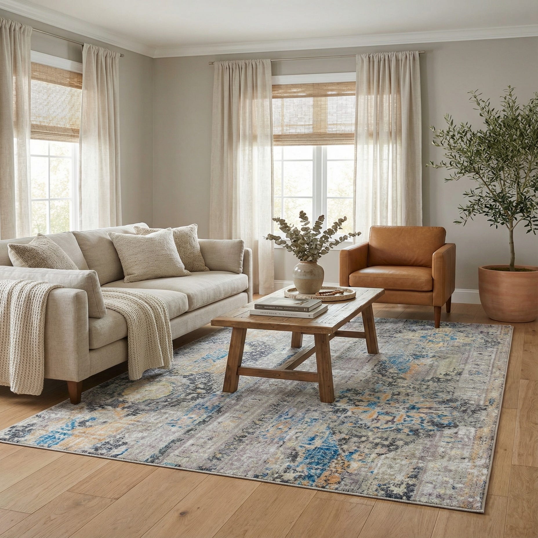 Primary color is Light Brown. Colors in this rug include: Light Brown, Blue, Gold, Gray, Ivory, Light Green, Violet.