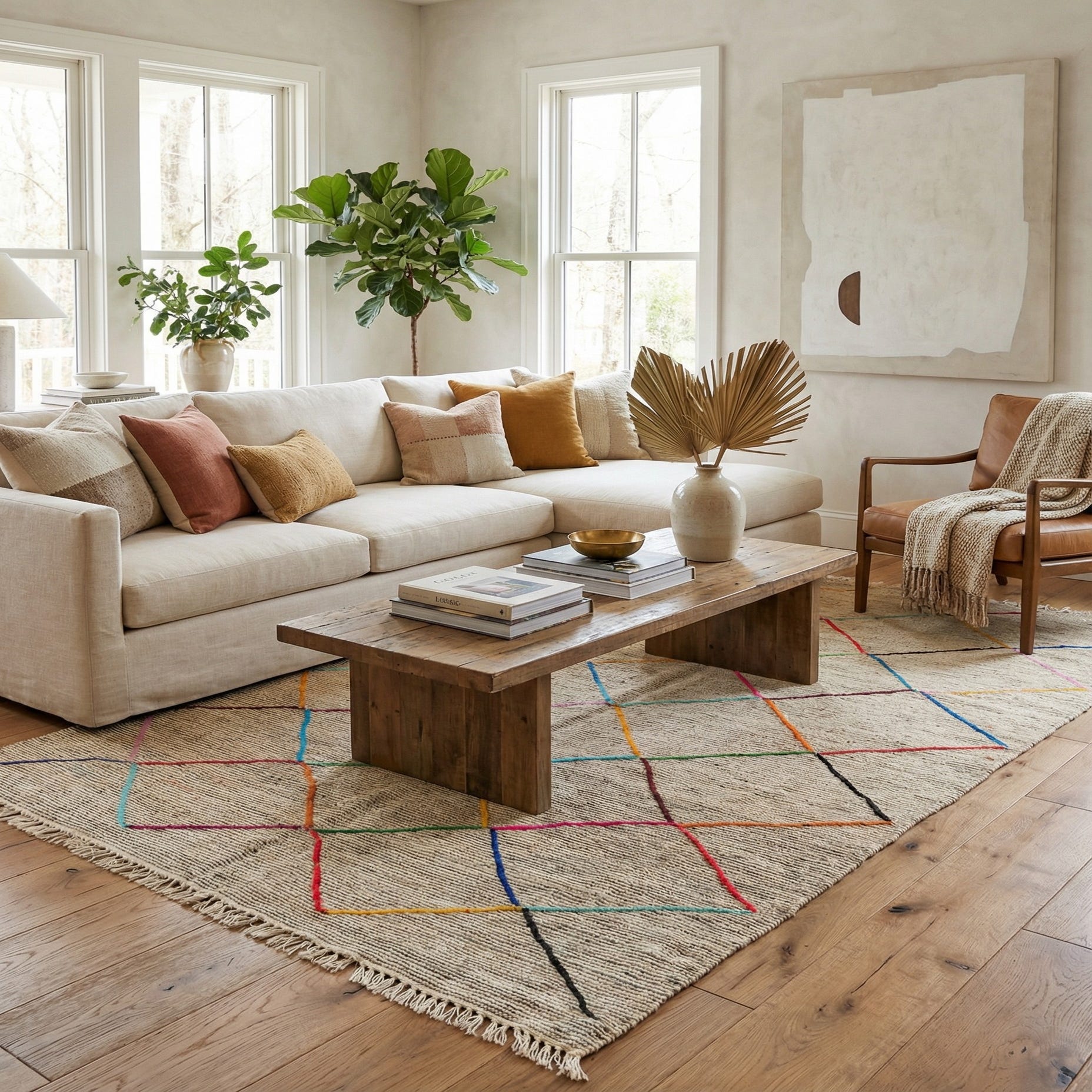 Primary color is Light Brown. Colors in this rug include: Light Brown, Orange, Red, Violet, Pink, Green, Blue, Yellow.