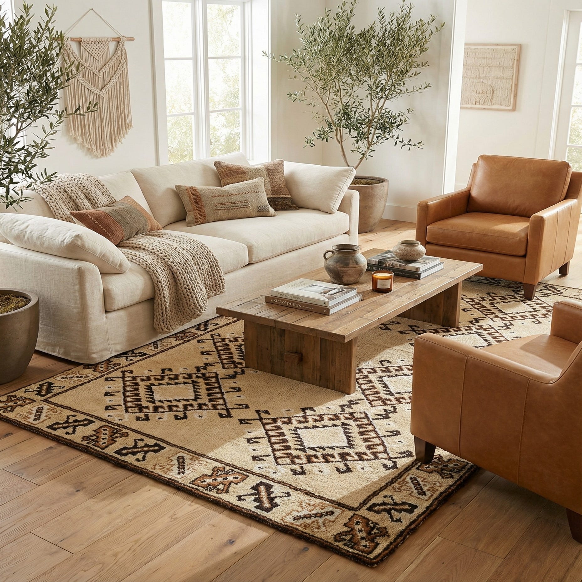 Primary color is Light Brown. Colors in this rug include: Light Brown, Brown, Ivory, Orange.