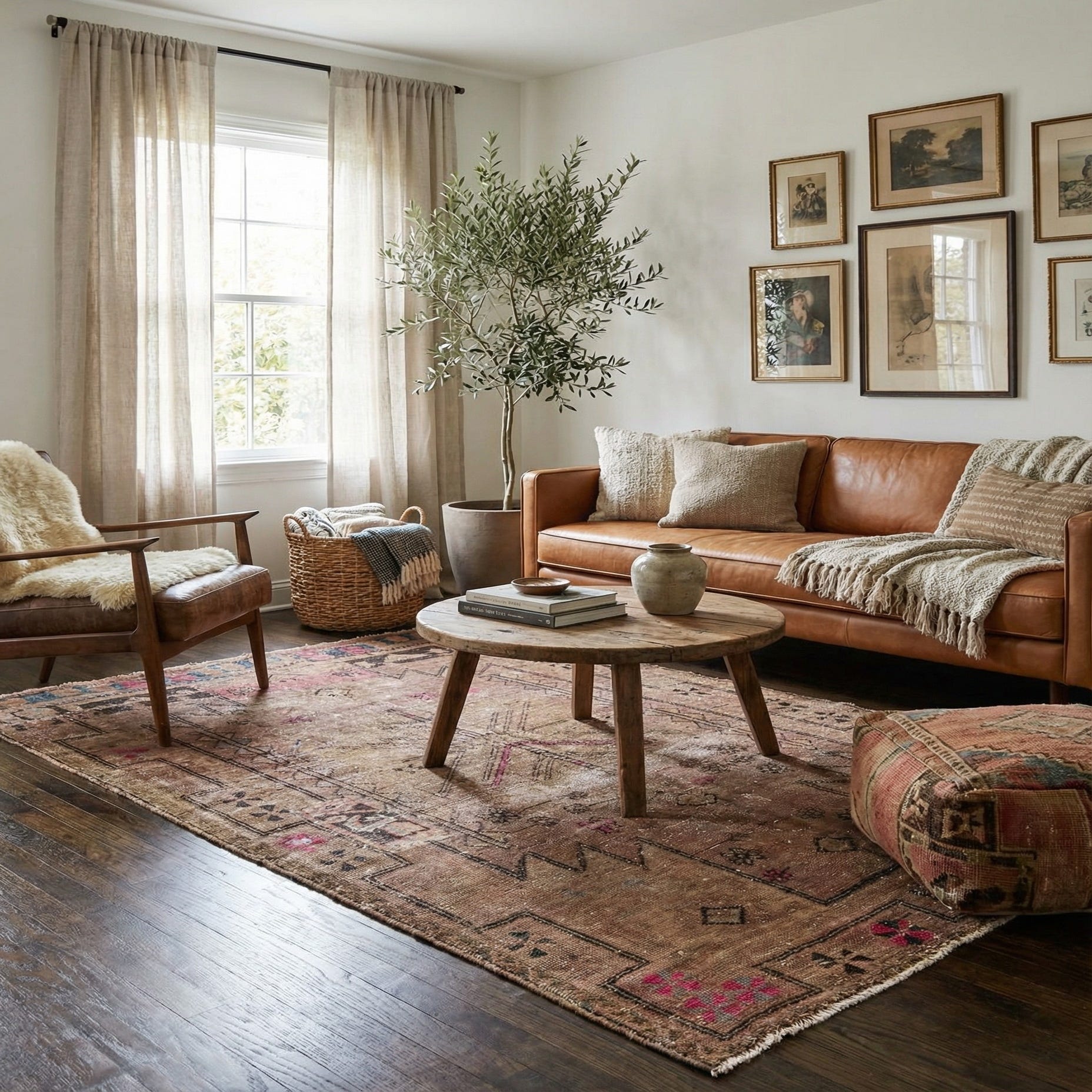 Primary color is Light Brown. Colors in this rug include: Light Brown, Brown, Navy Blue, Rust Red, Pink.