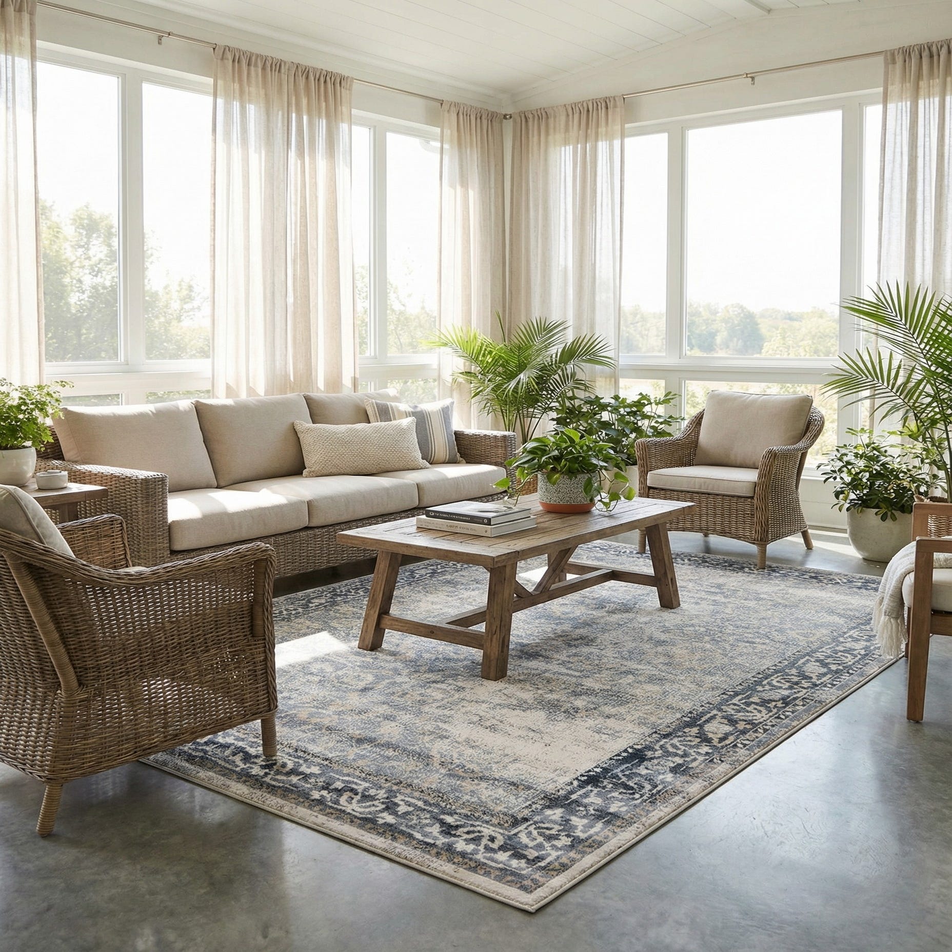 85% Polypropylene Heatset and 15% Chenille Yarn with 100% cotton backing for extra durability and softness. Pile textured for vintage look and feel