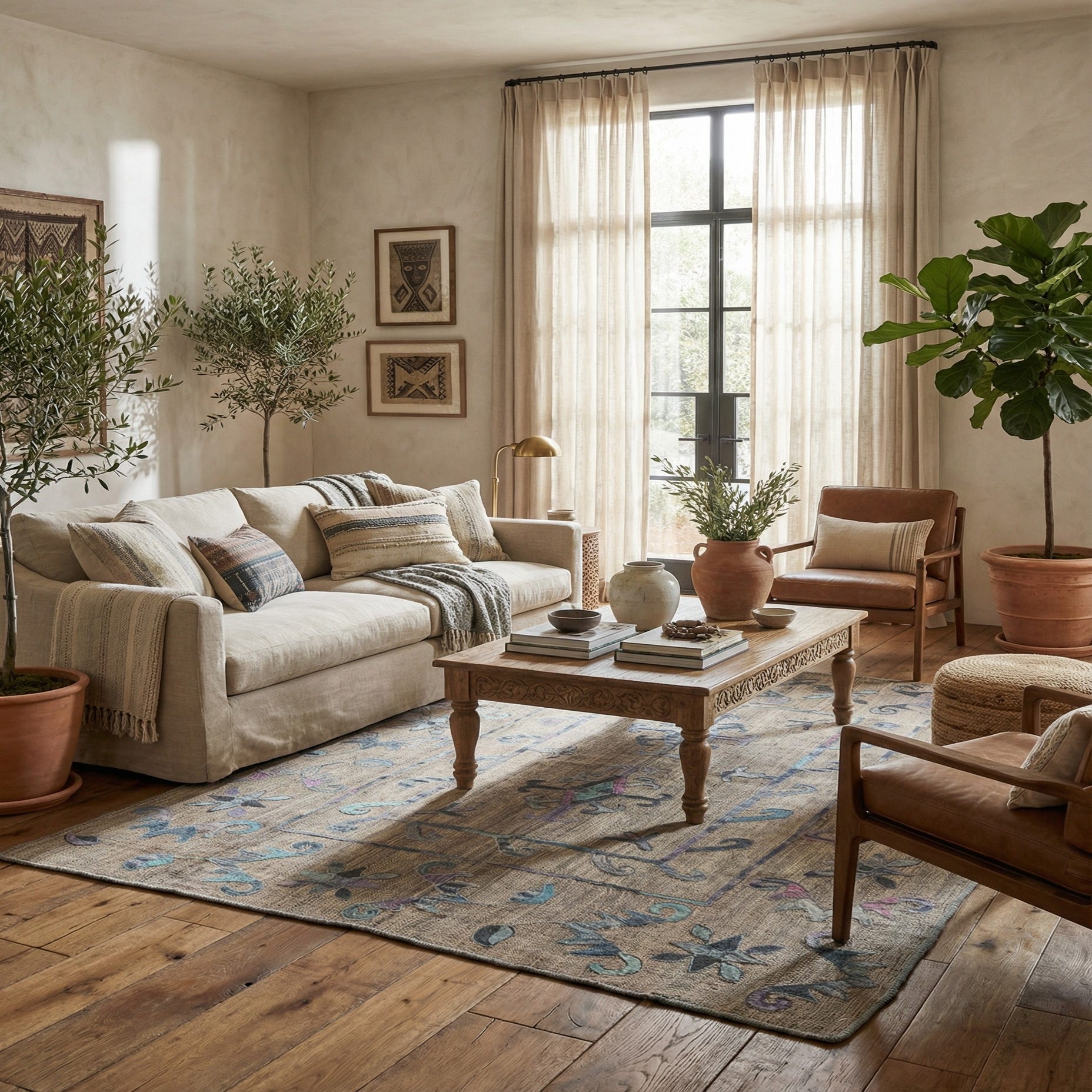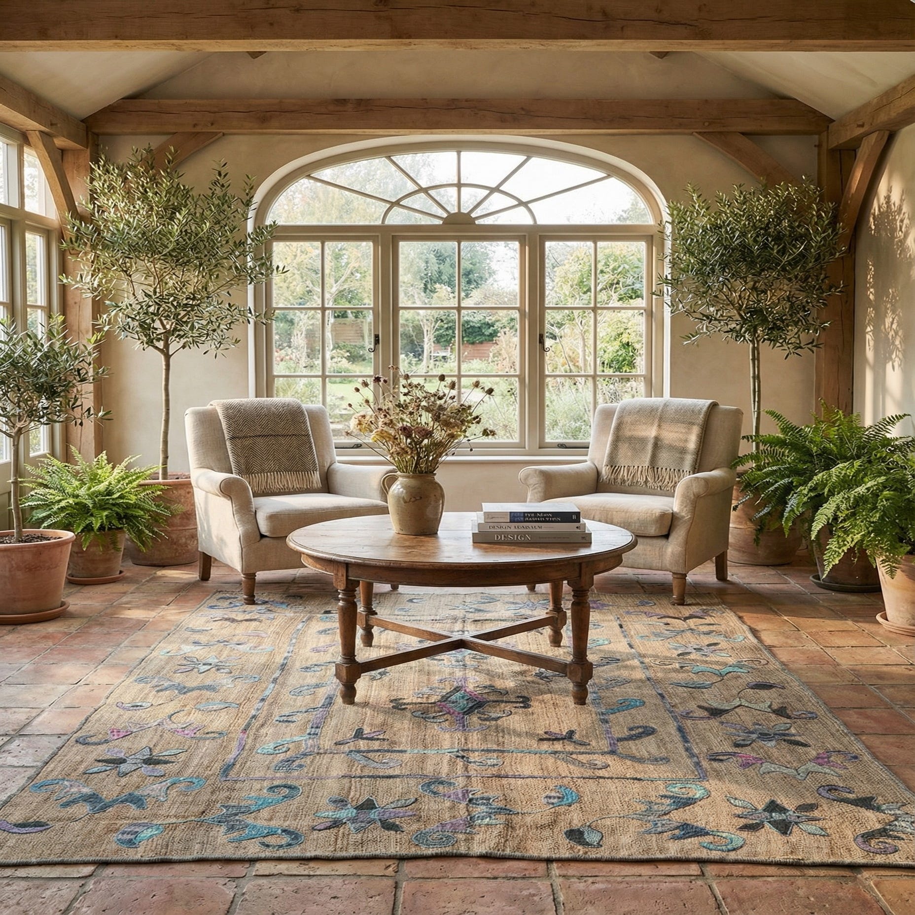 Primary color is Light Brown. Colors in this rug include: Light Brown, Violet, Navy Blue, Light Blue.