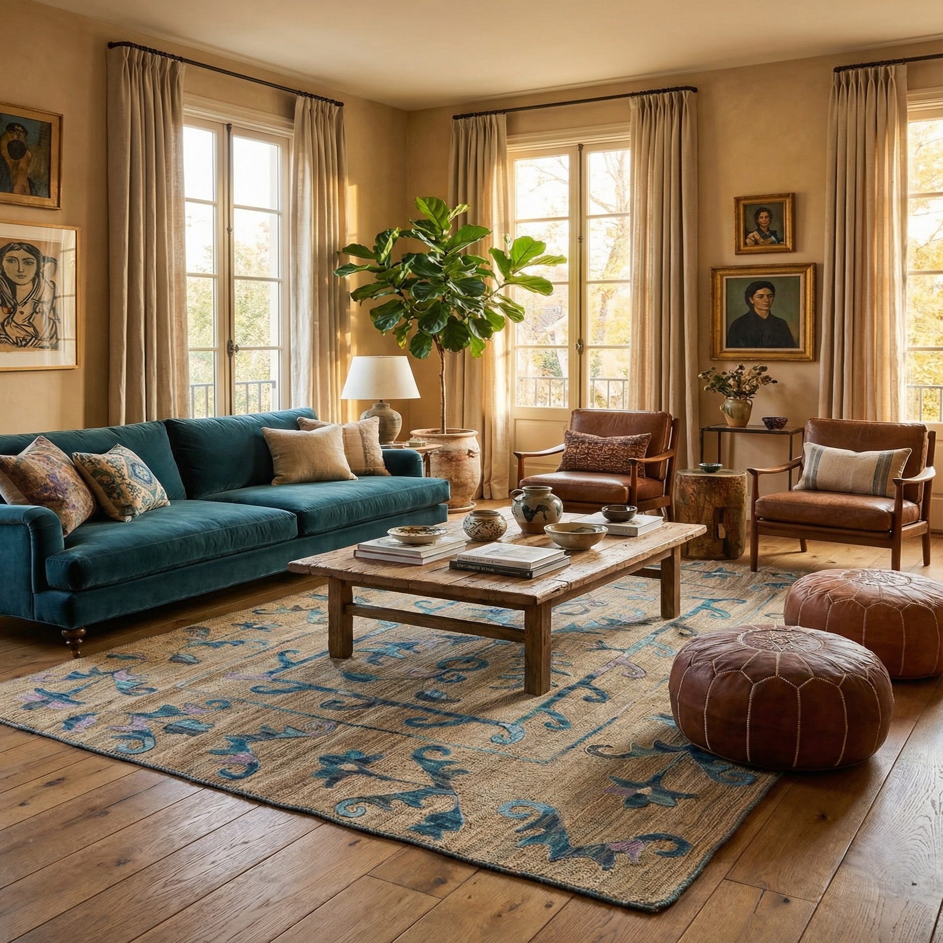 Primary color is Light Brown. Colors in this rug include: Light Brown, Navy Blue, Light Blue, Violet.