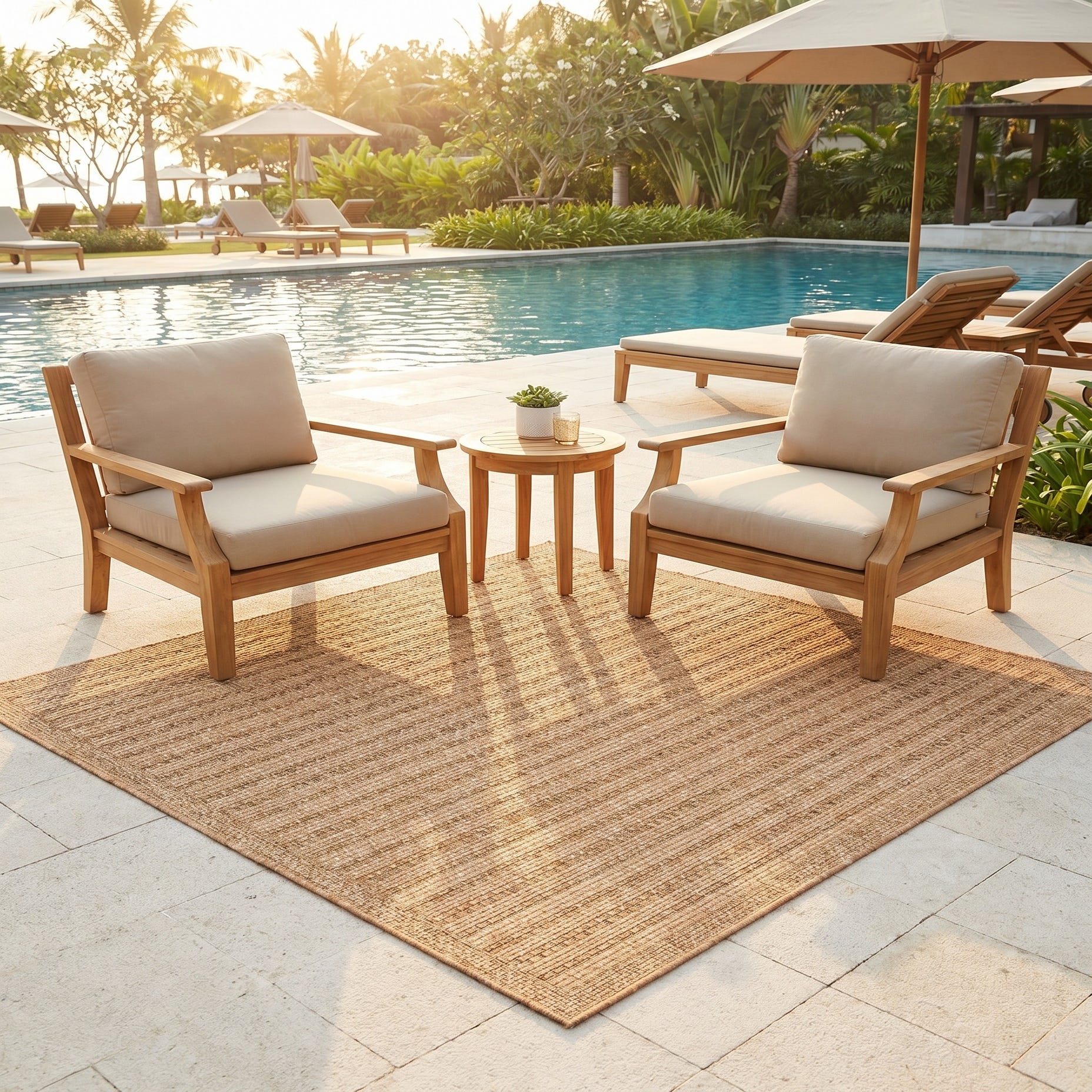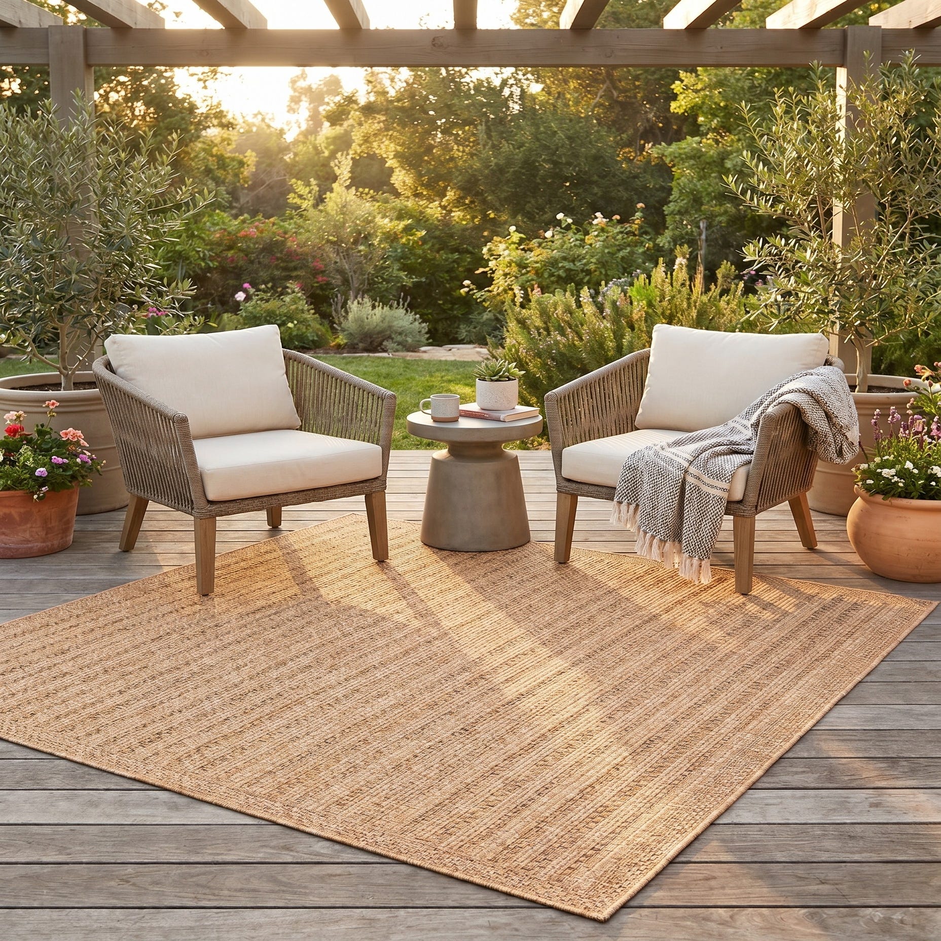 I really like the fact you can sweep it off very easily where some rugs including one I had purchased before this one collected grass and debris in the grooves. I also ordered a 6 x 9 beige rug with/flower print that I got for $53 but decided to go with the brown rug (5 Ă— 8) this year. Rugs have a durable straw feel. Pretty much what I expected. Just one downer...with a heavy wind the sides can roll up. I purchased a double sided tape which I haven't used yet but that should NOT stop anyone from purchasing the outdoor botanical rugs.