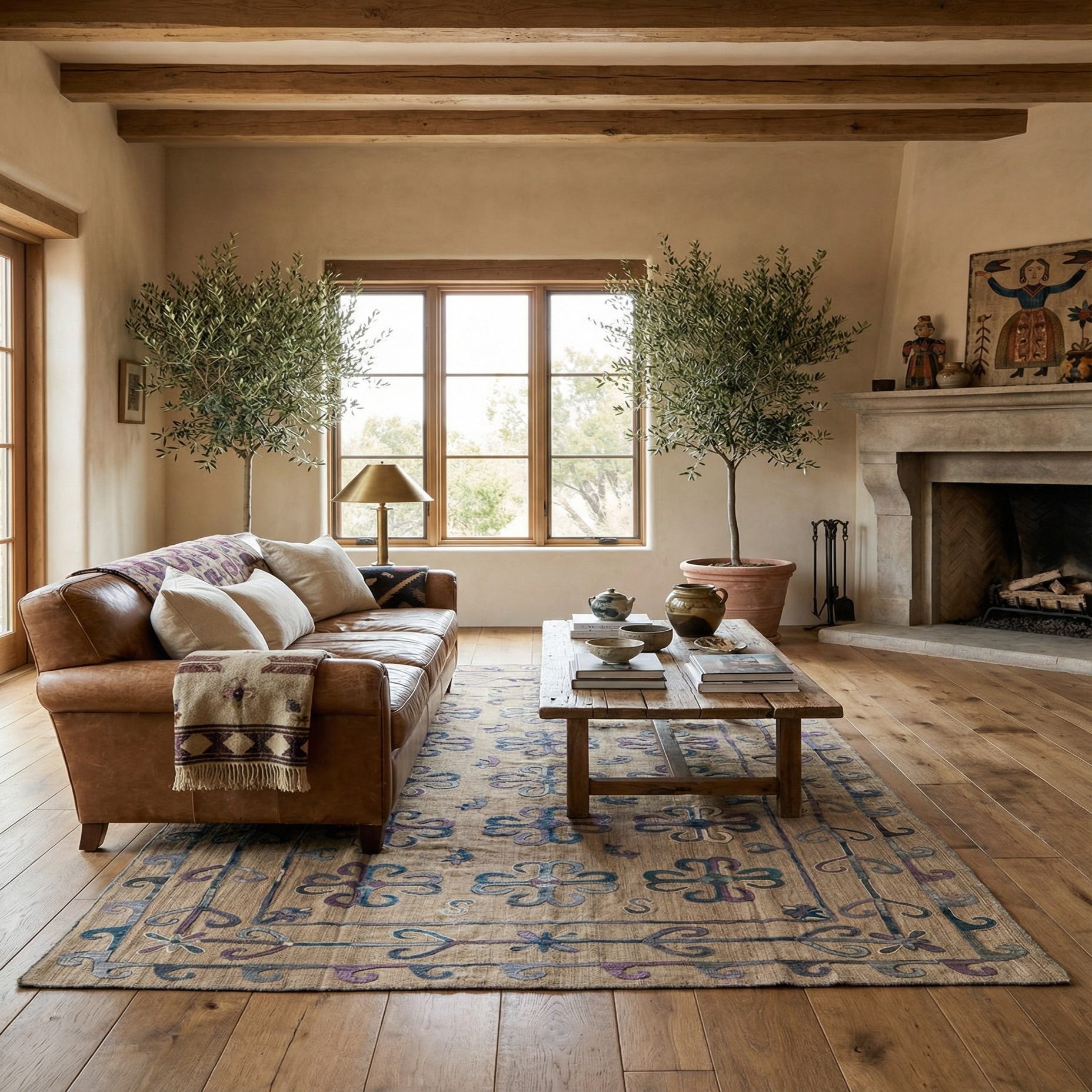 Primary color is Light Brown. Colors in this rug include: Light Brown, Ivory, Navy Blue, Violet, Gray.