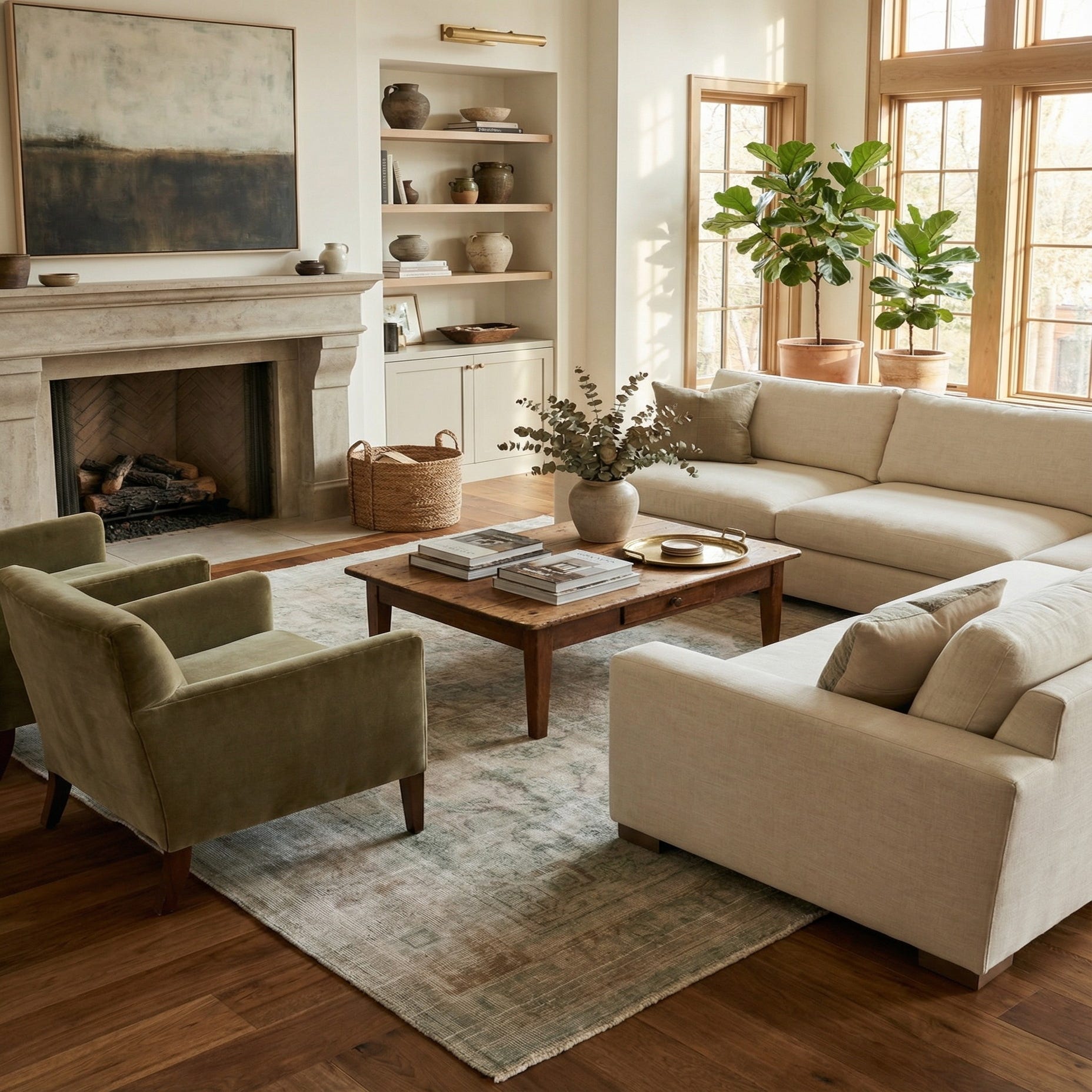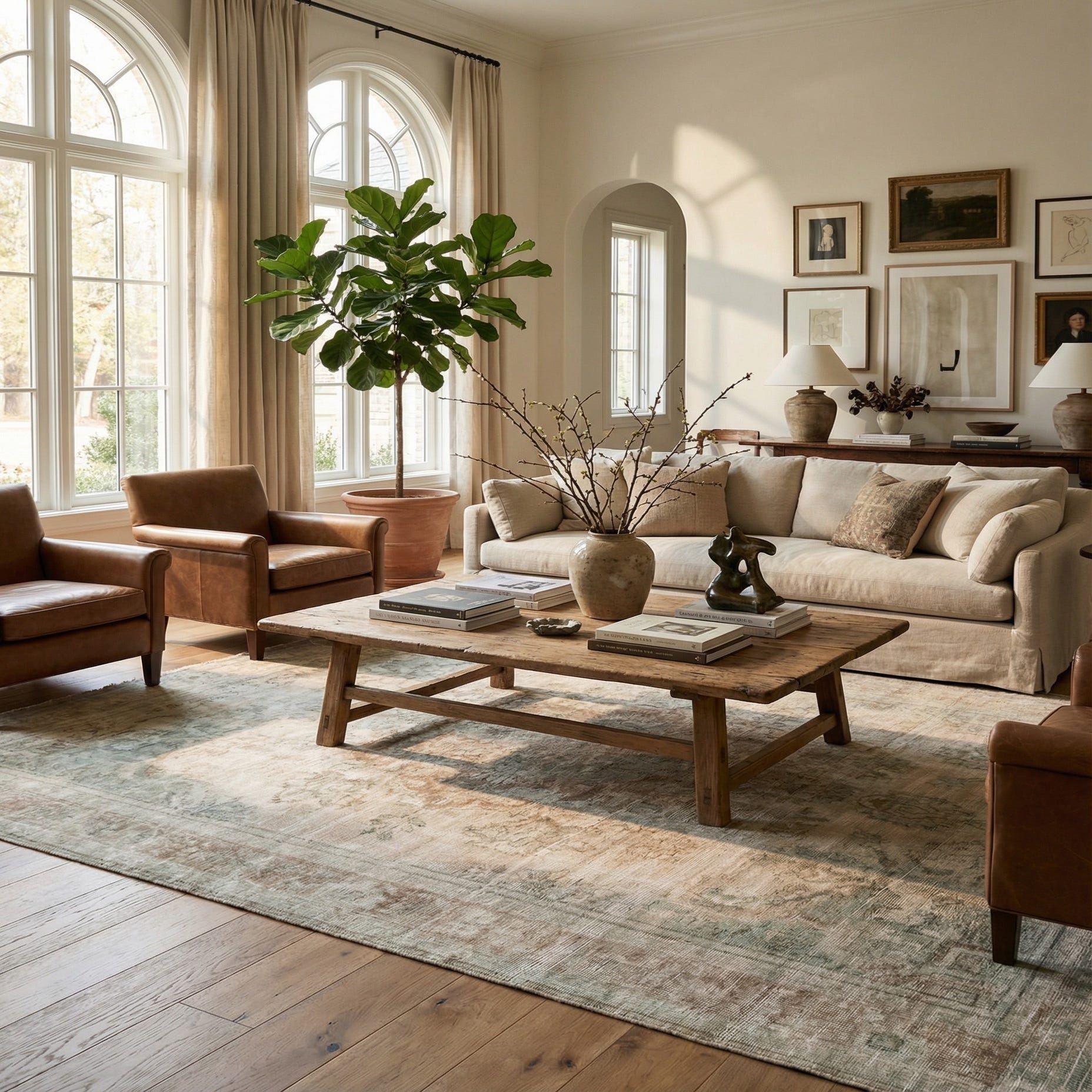 Primary color is Light Brown. Colors in this rug include: Light Brown, Brown, Green.