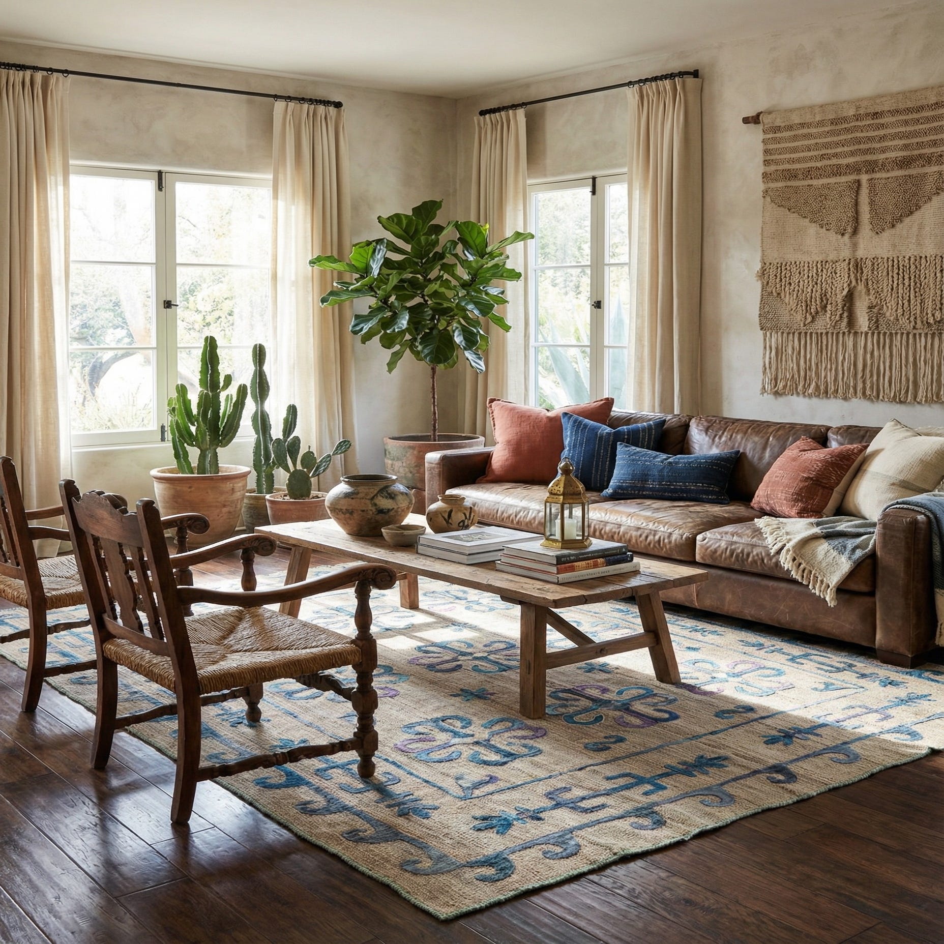 Primary color is Light Brown. Colors in this rug include: Light Brown, Blue, Violet, Ivory.
