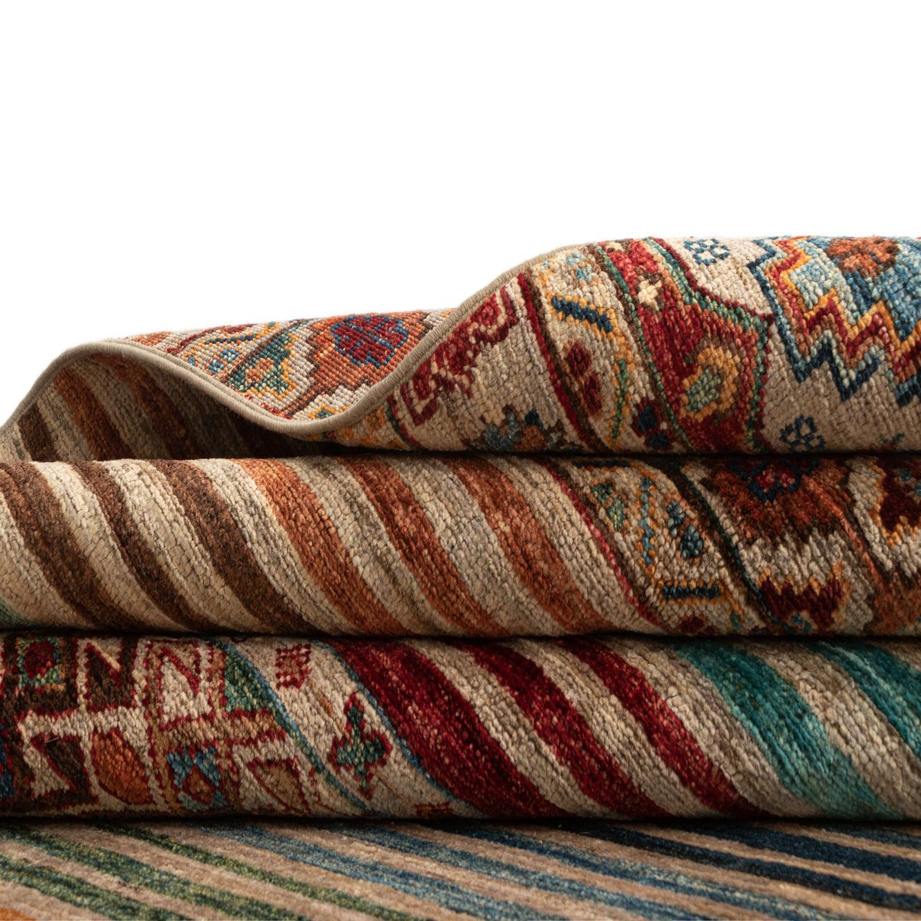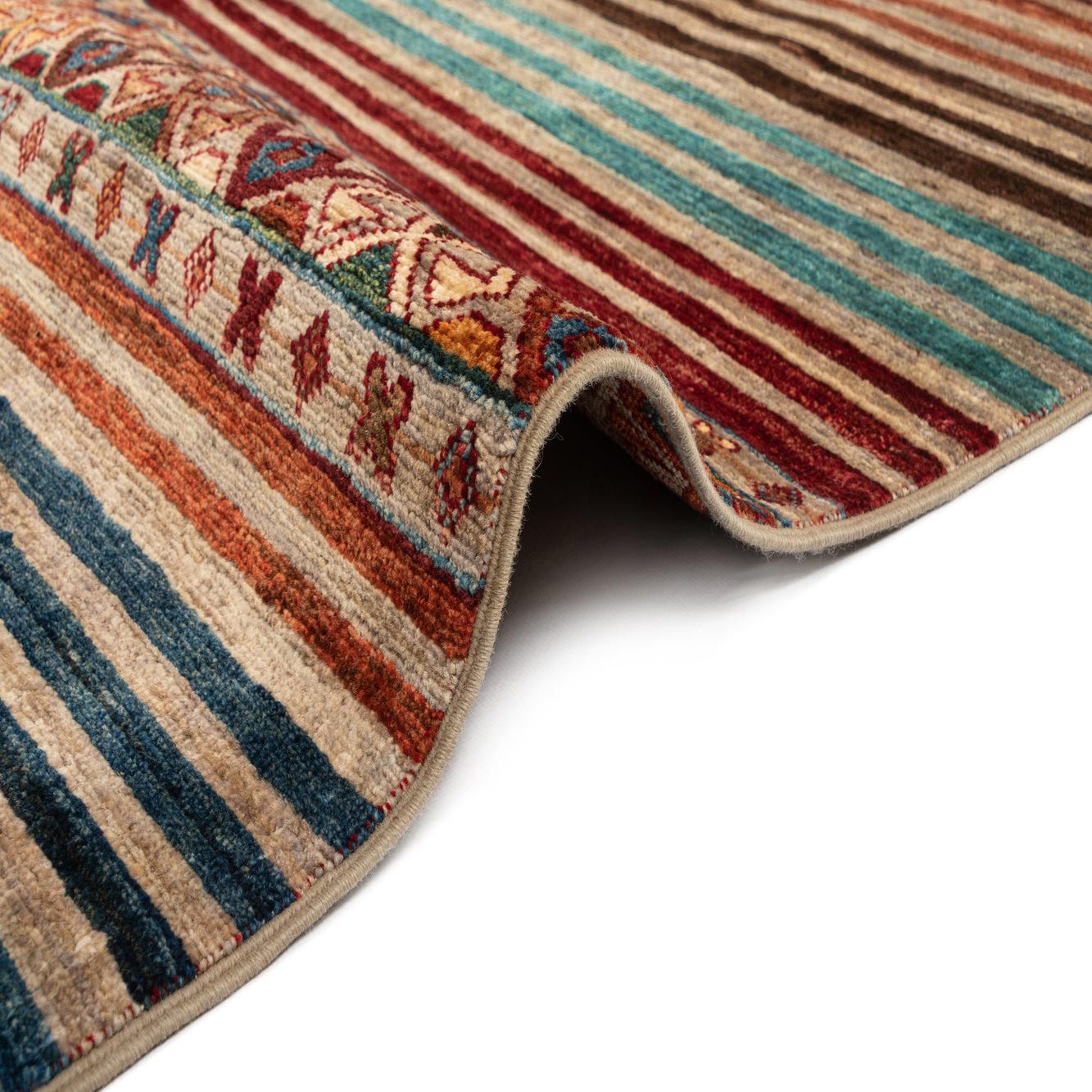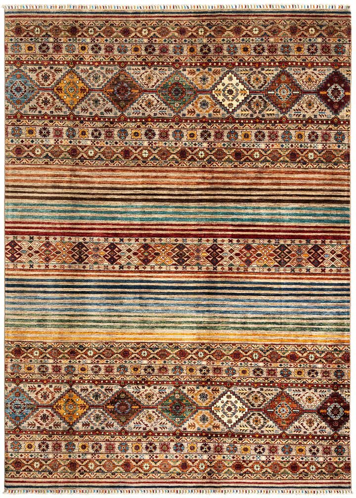 Primary color is Light Brown. Colors in this rug include: Light Brown, Light Brown, Red, Blue, Orange, Green, Brown.