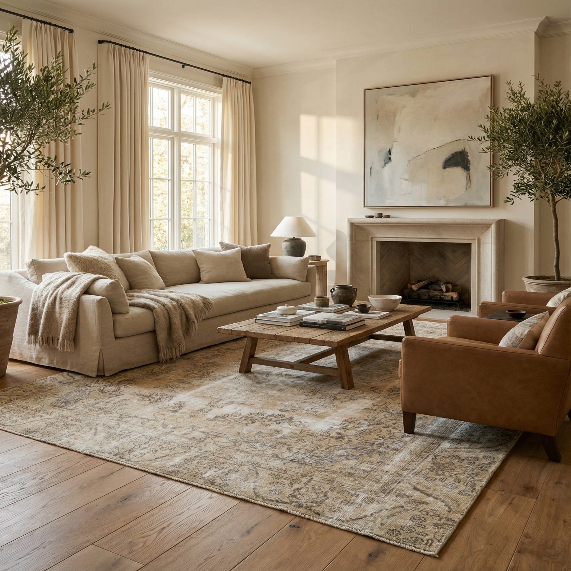 Primary color is Light Brown. Colors in this rug include: Light Brown, Brown, Ivory, Green.