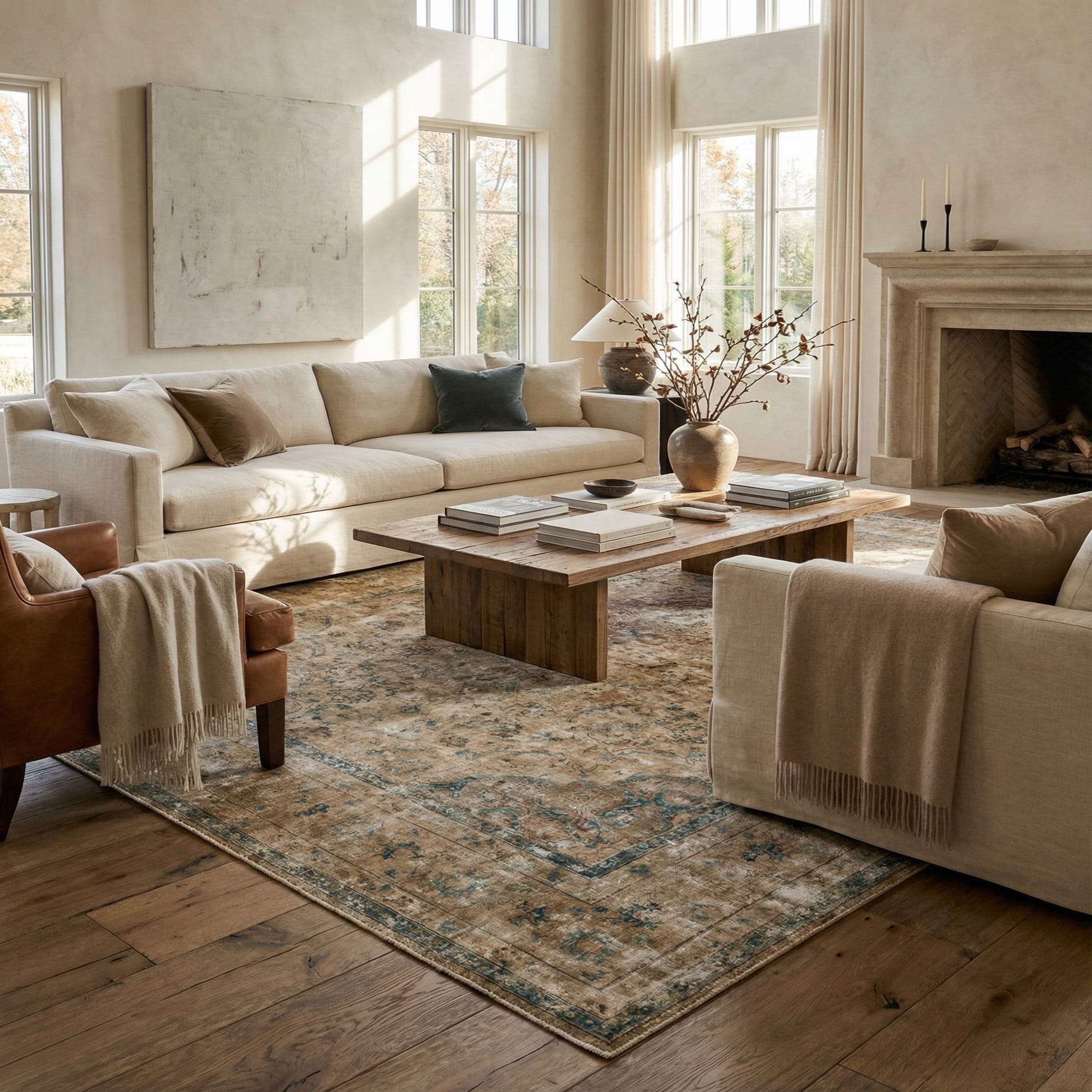 Primary color is Light Brown. Colors in this rug include: Light Brown, Ivory, Navy Blue, Brown.