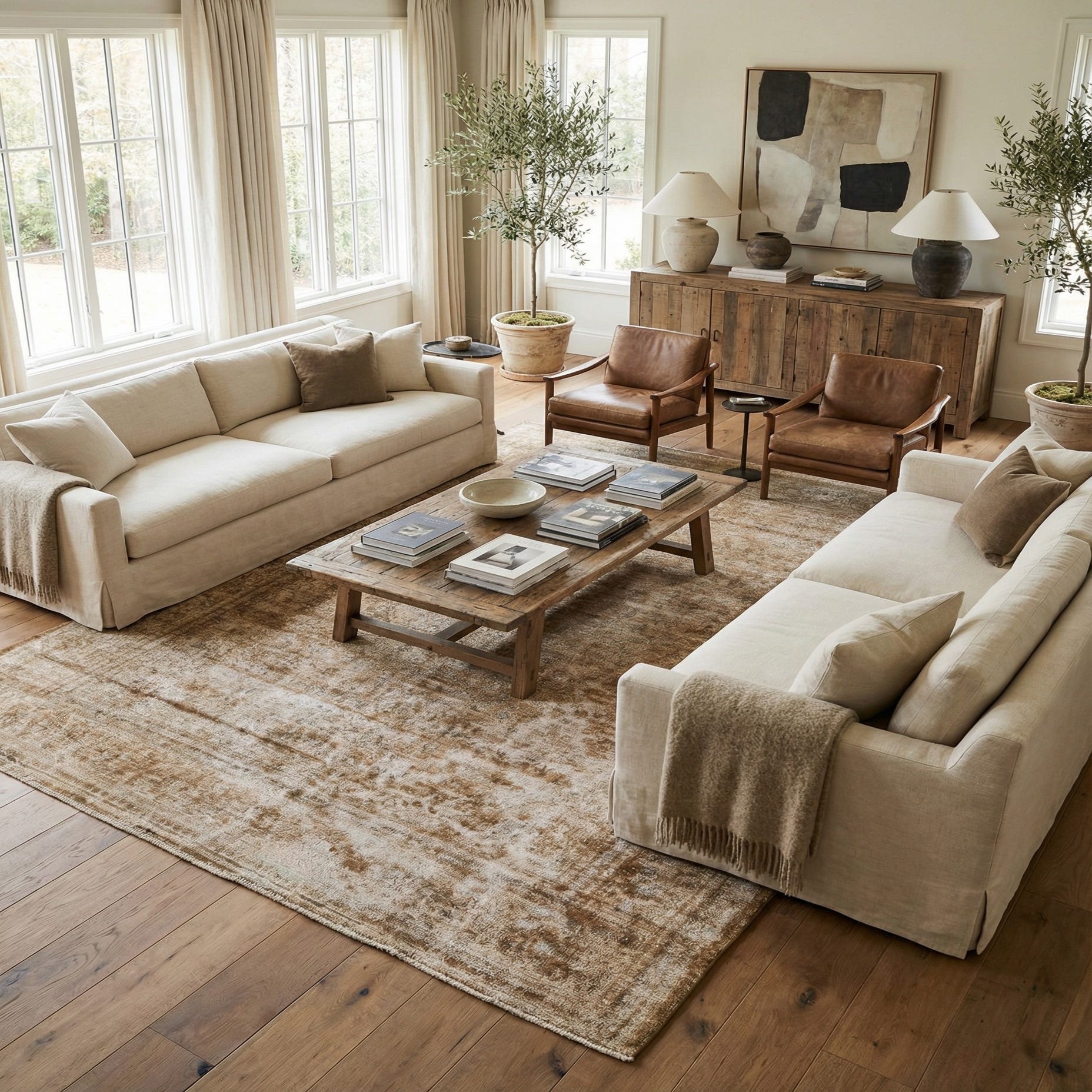 Primary color is Light Brown. Colors in this rug include: Light Brown, Brown, Beige, Ivory, Navy Blue.