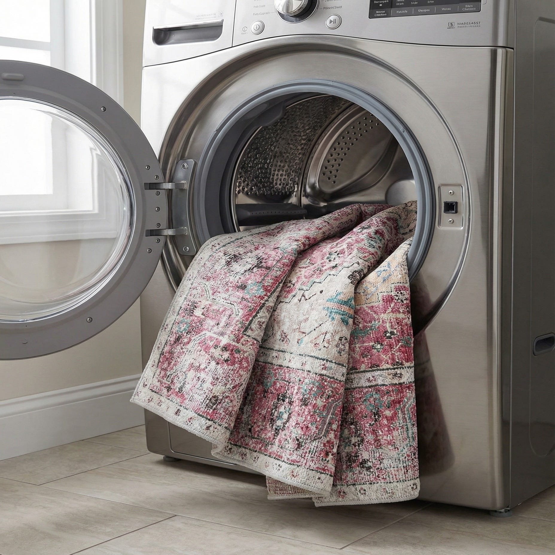 Primary color is Light Coral Pink. Colors in this rug include: Light Coral Pink, Blue, Ivory, Gray, Green, Black.