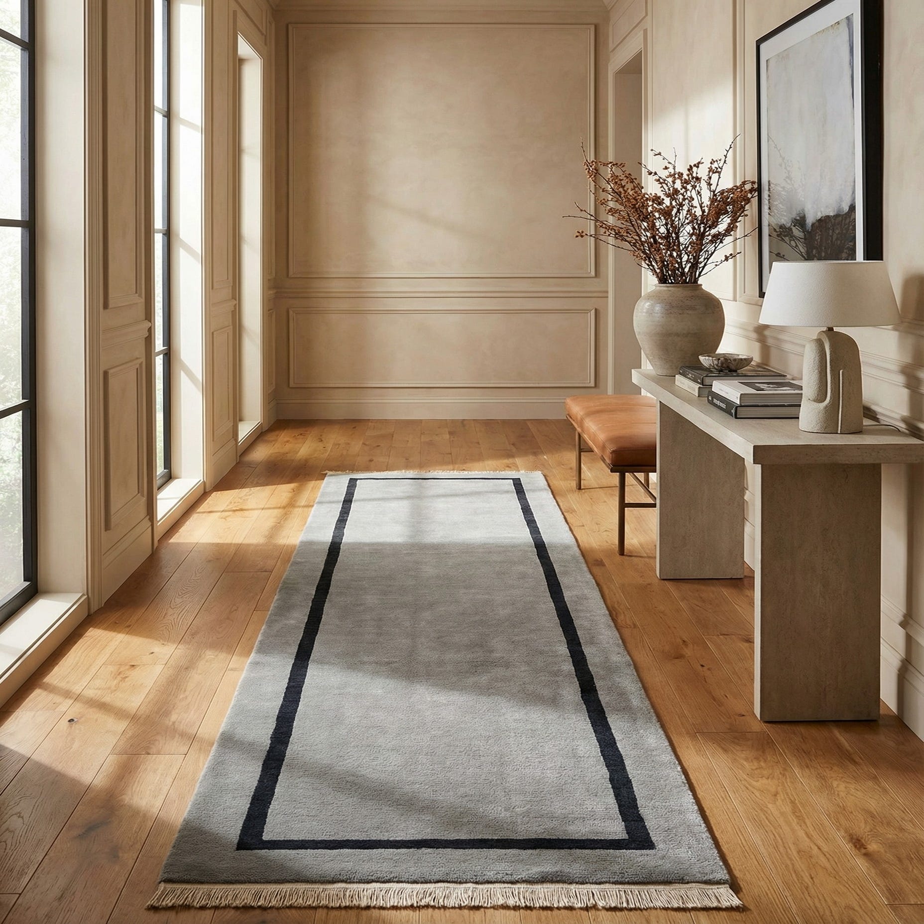 Primary color is Light Gray. Colors in this rug include: Light Gray, Navy Blue.