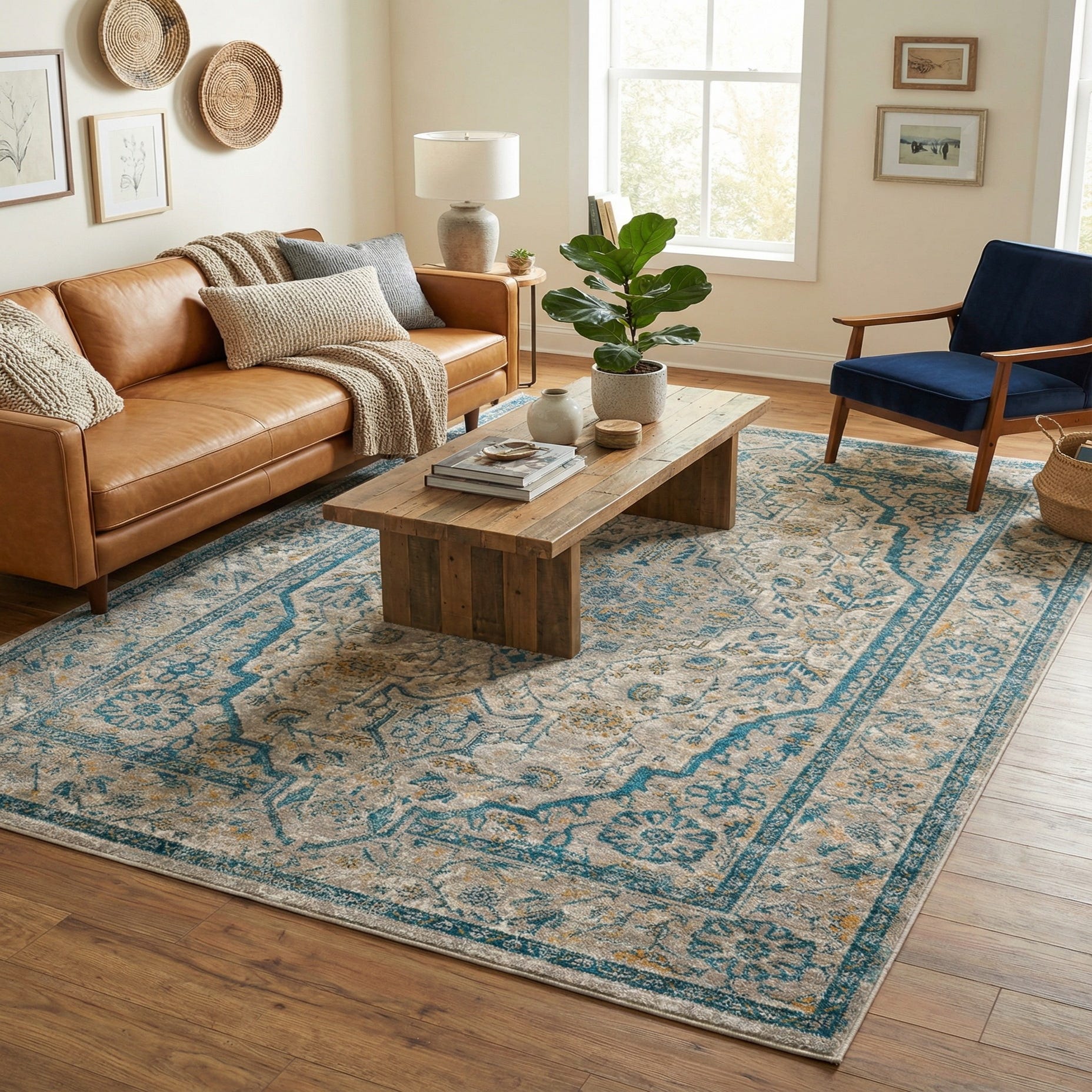 Primary color is Light Gray. Colors in this rug include: Light Gray, Blue, Ivory, Light Blue, Yellow.
