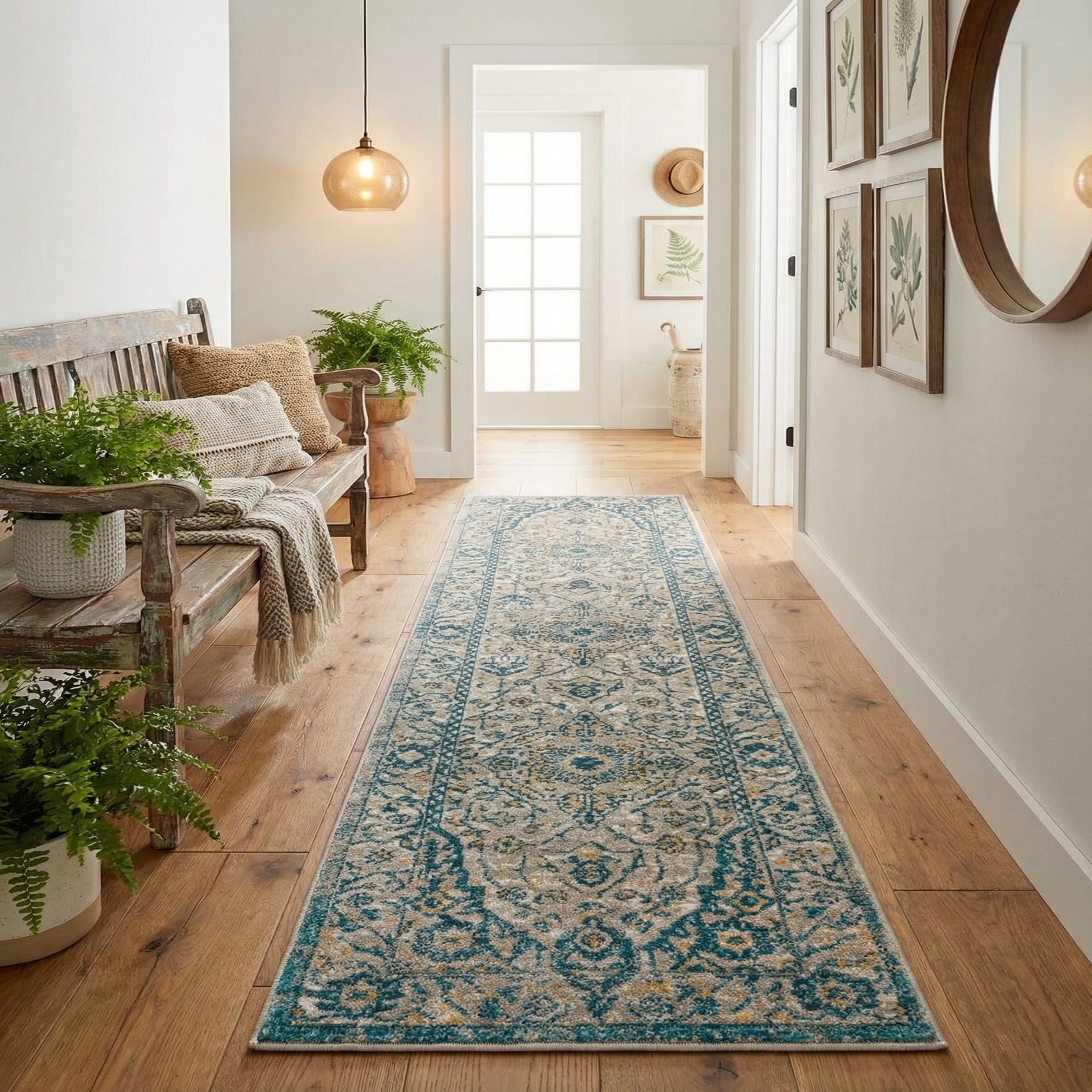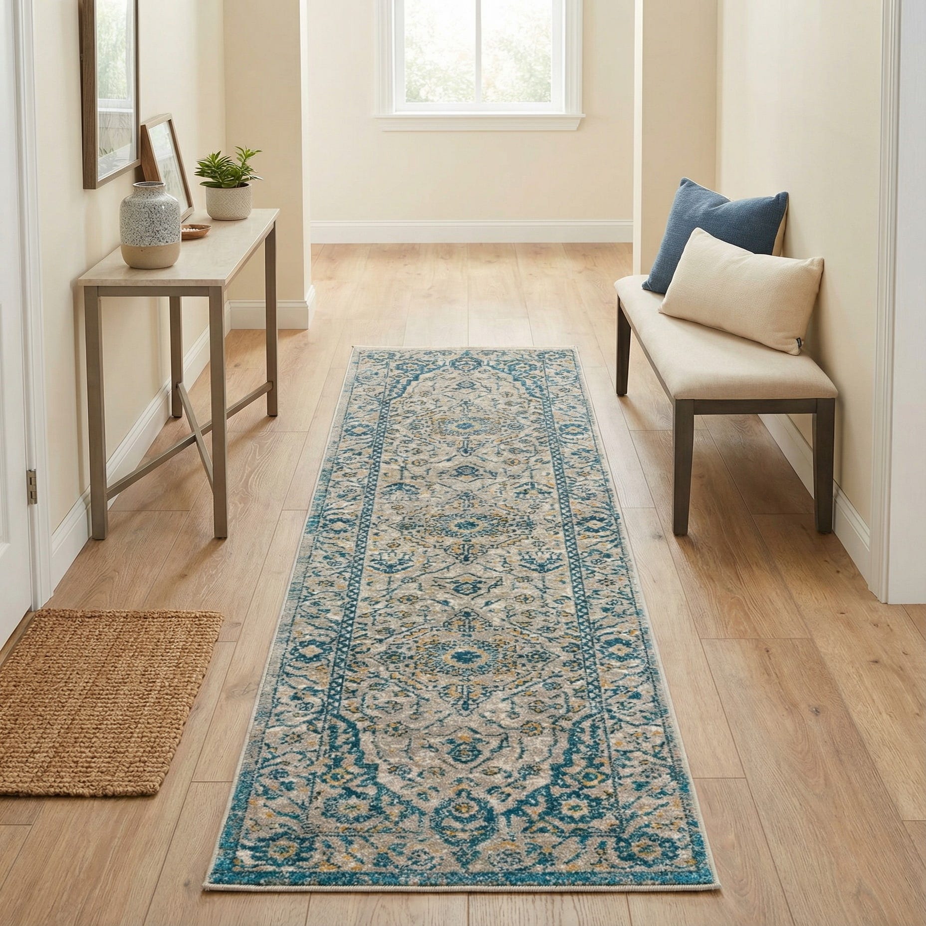 Primary color is Light Gray. Colors in this rug include: Light Gray, Blue, Navy Blue, Ivory, Yellow.