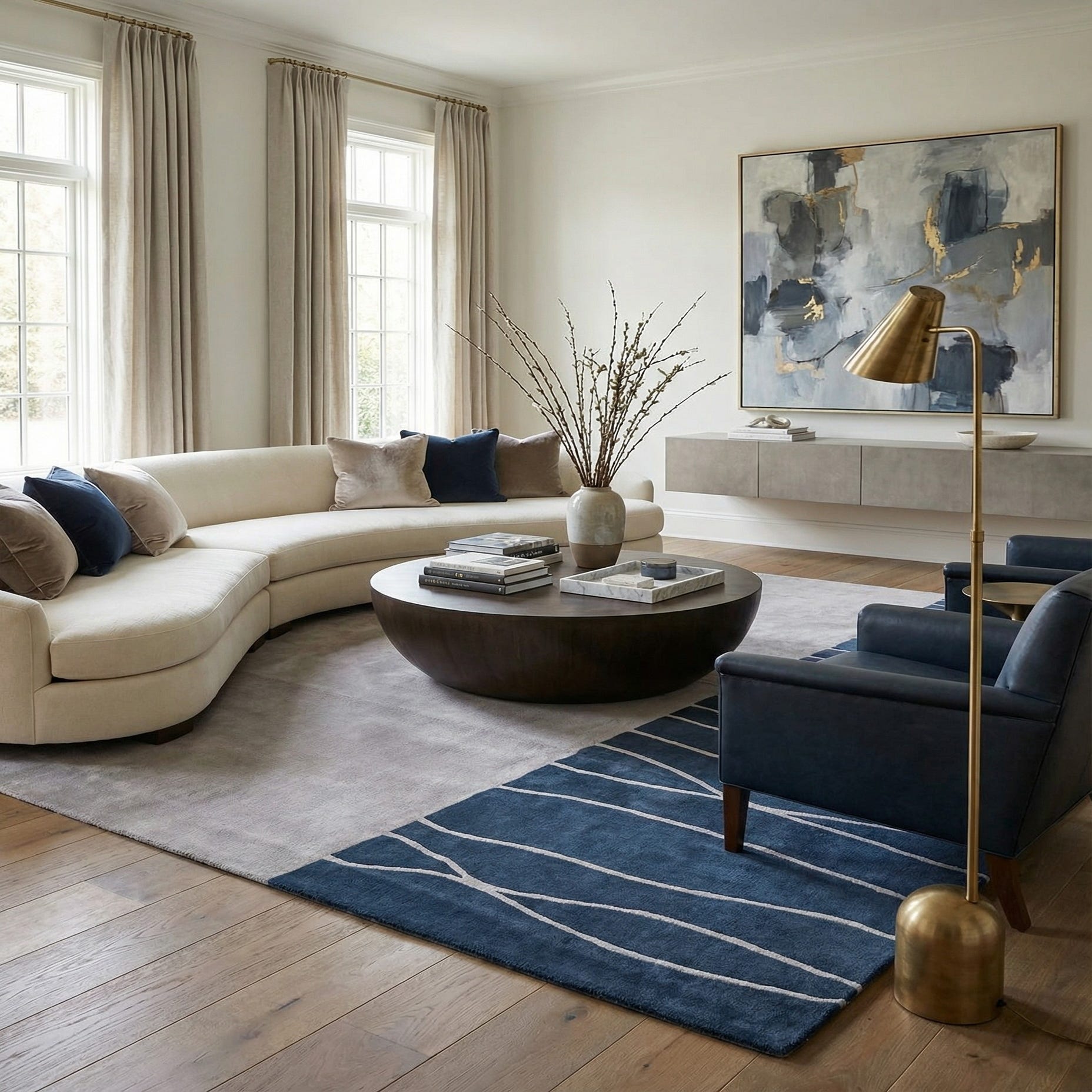 Primary color is Light Gray. Colors in this rug include: Light Gray, Navy Blue.