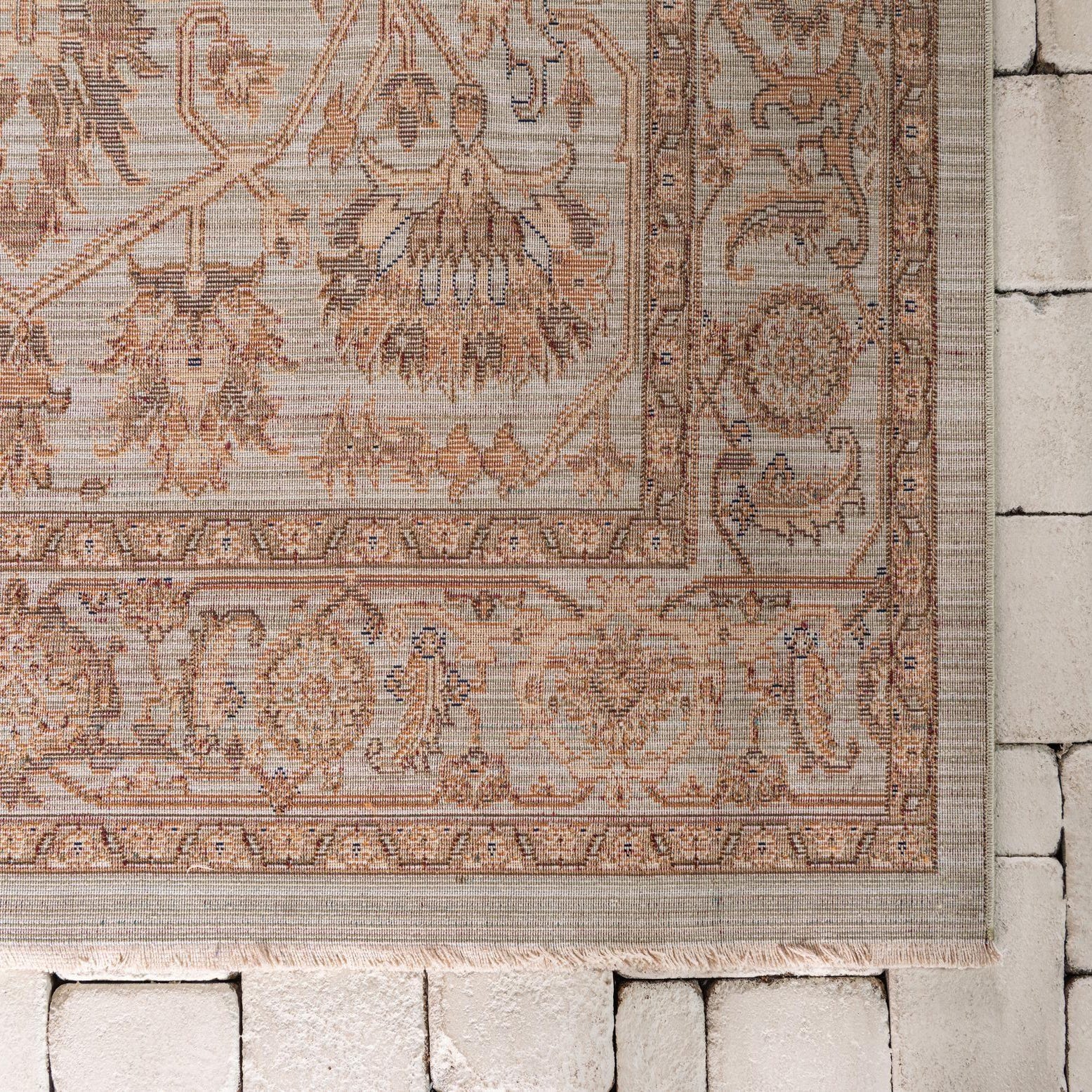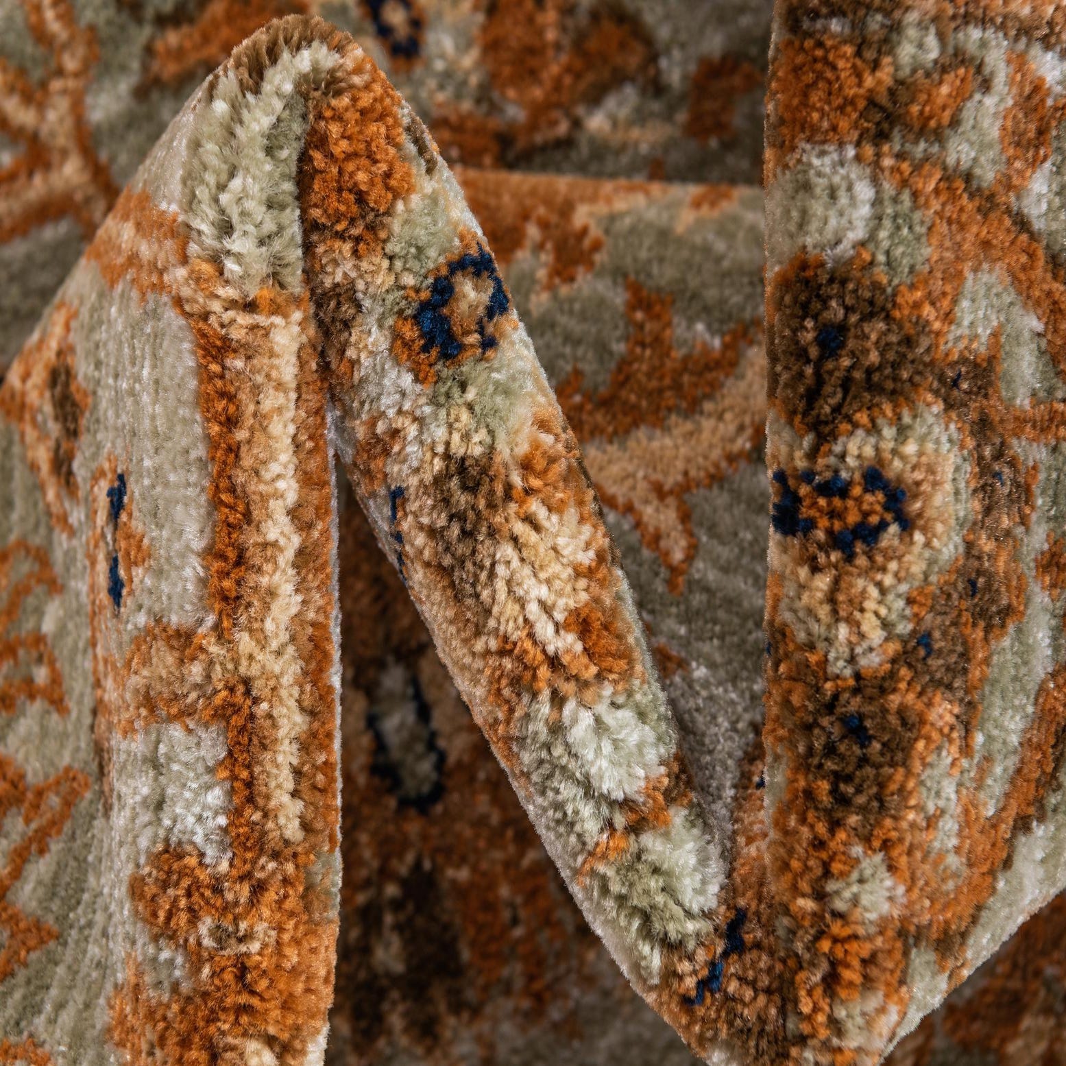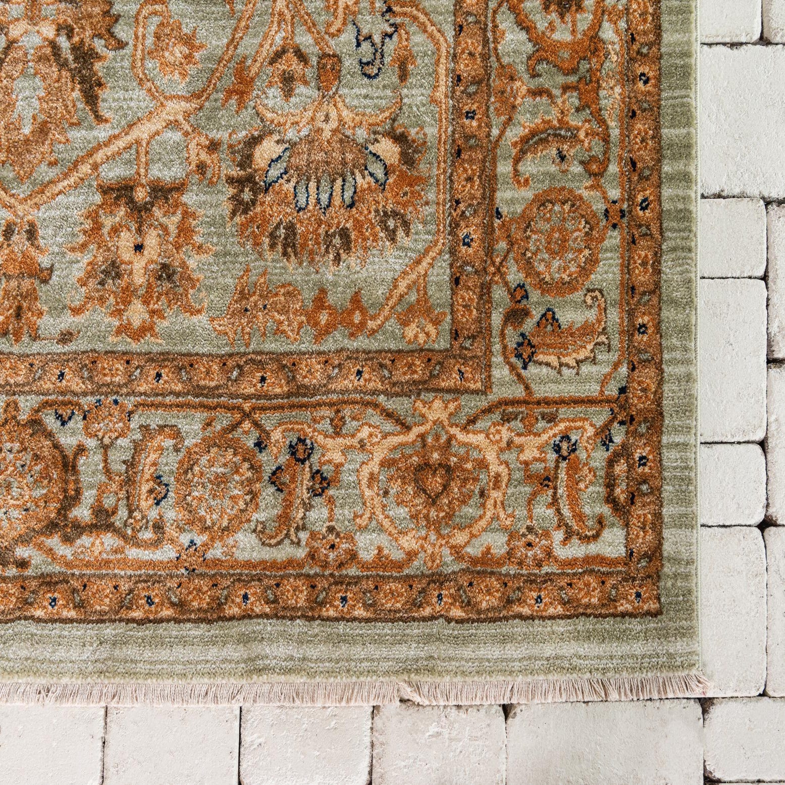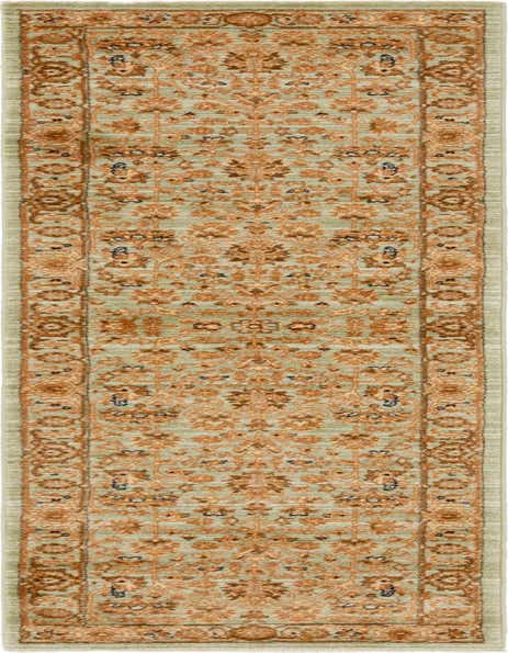 Primary color is Light Green. Colors in this rug include: Light Green, Burgundy, Orange, Tan, Navy Blue.
