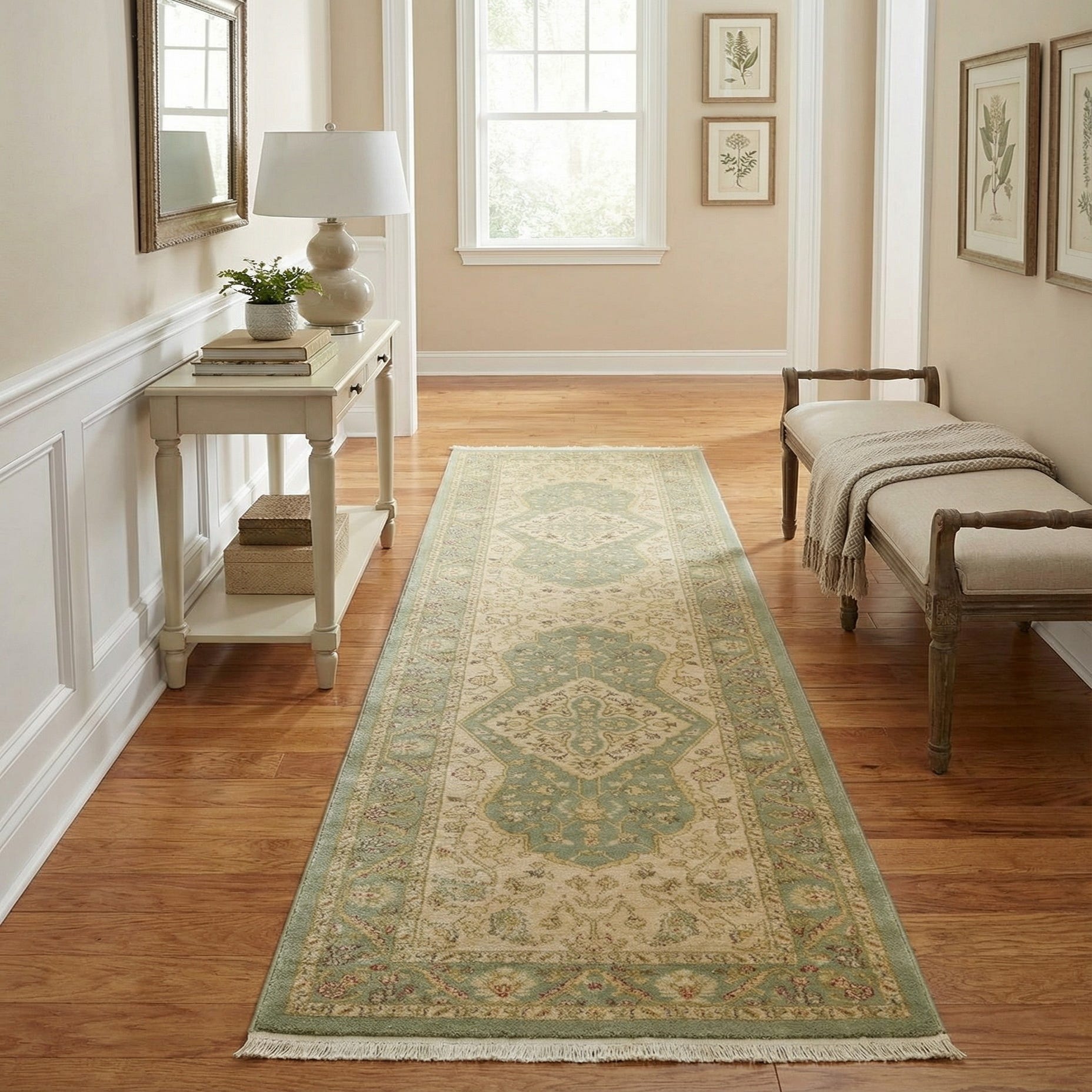 Primary color is Light Green. Colors in this rug include: Light Green, Cream.
