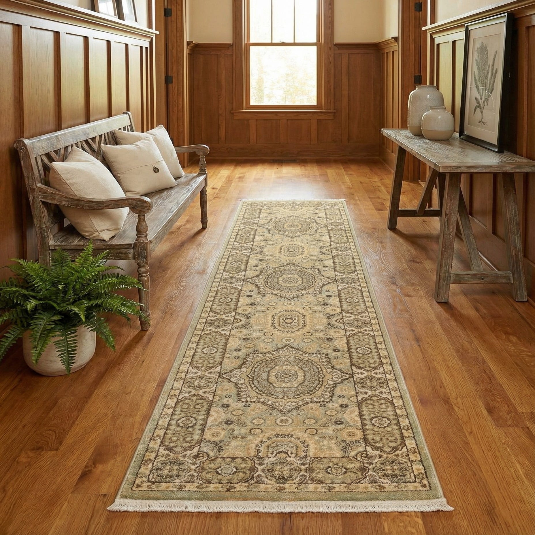 Primary color is Light Green. Colors in this rug include: Light Green, Brown, Cream, Light Brown.