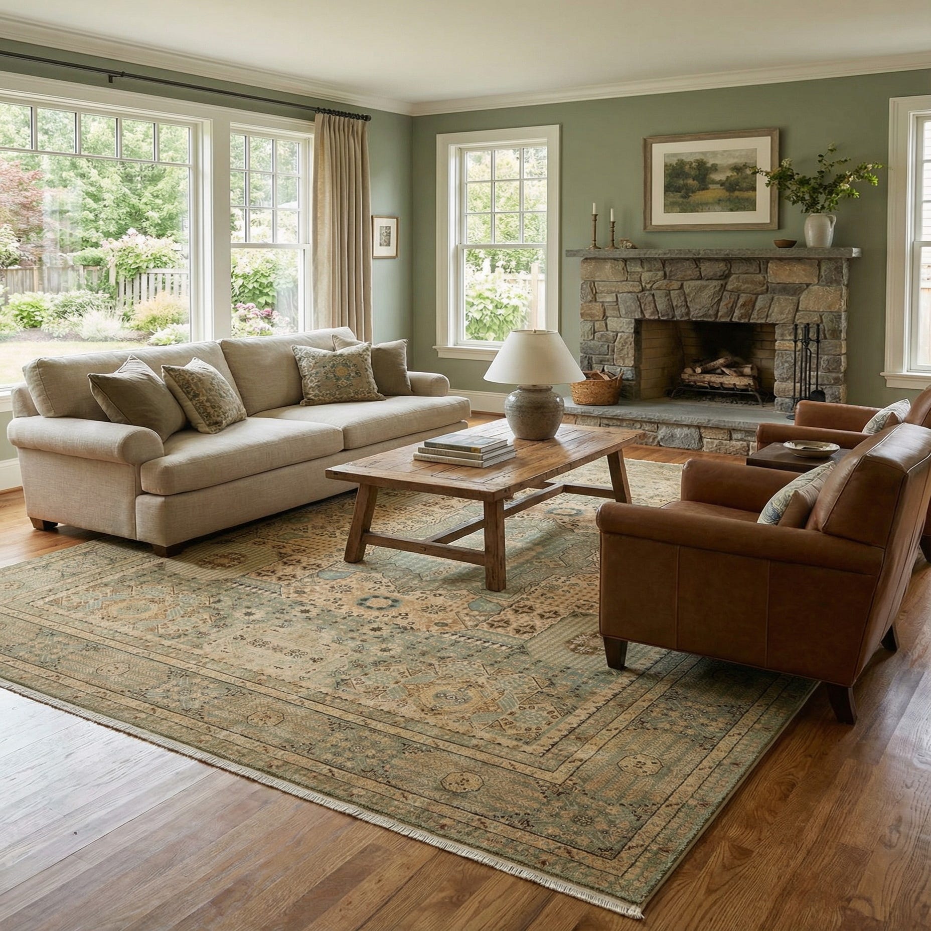 Primary color is Light Green. Colors in this rug include: Light Green, Brown, Cream, Light Blue, Olive, Tan.