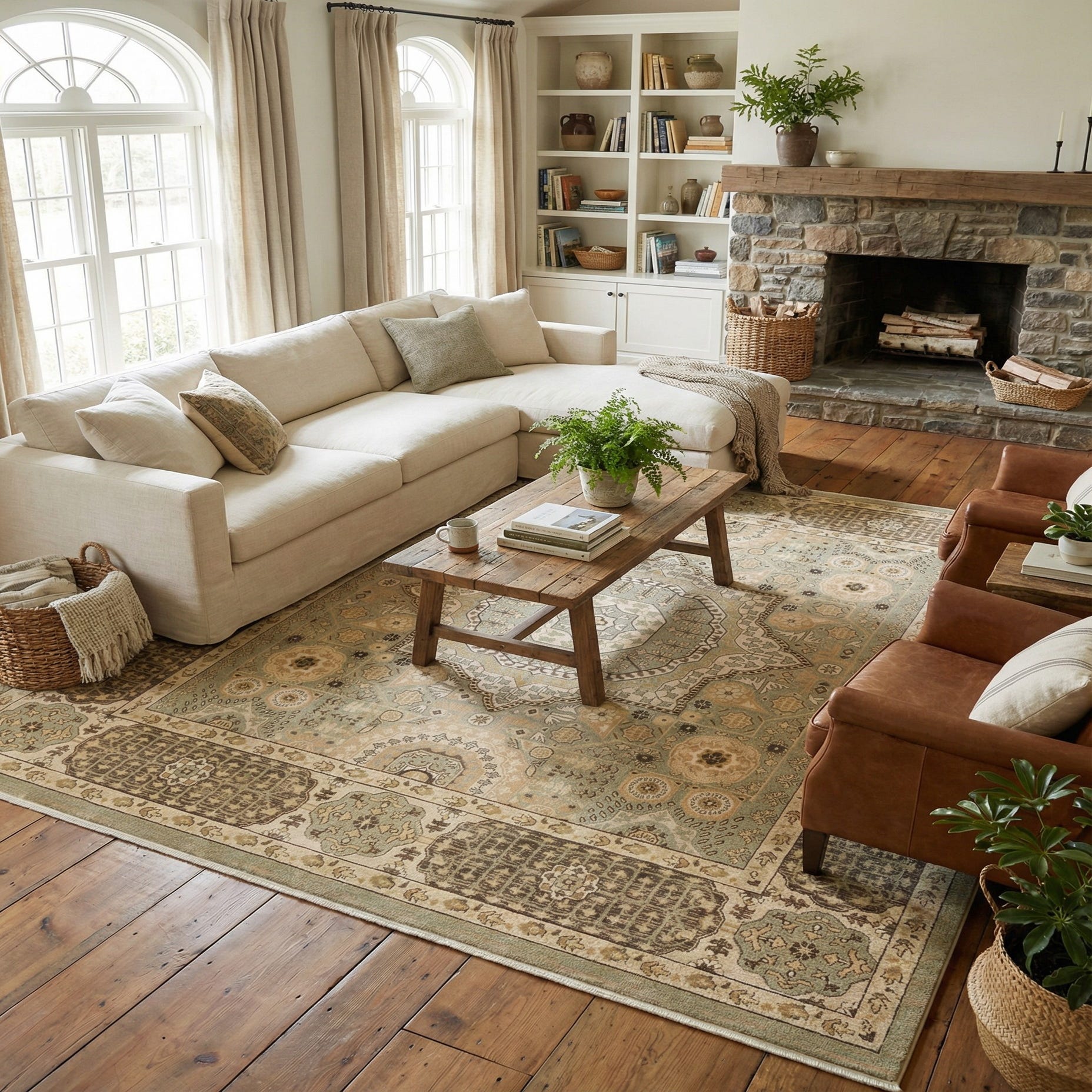 Primary color is Light Green. Colors in this rug include: Light Green, Brown, Cream, Light Brown.