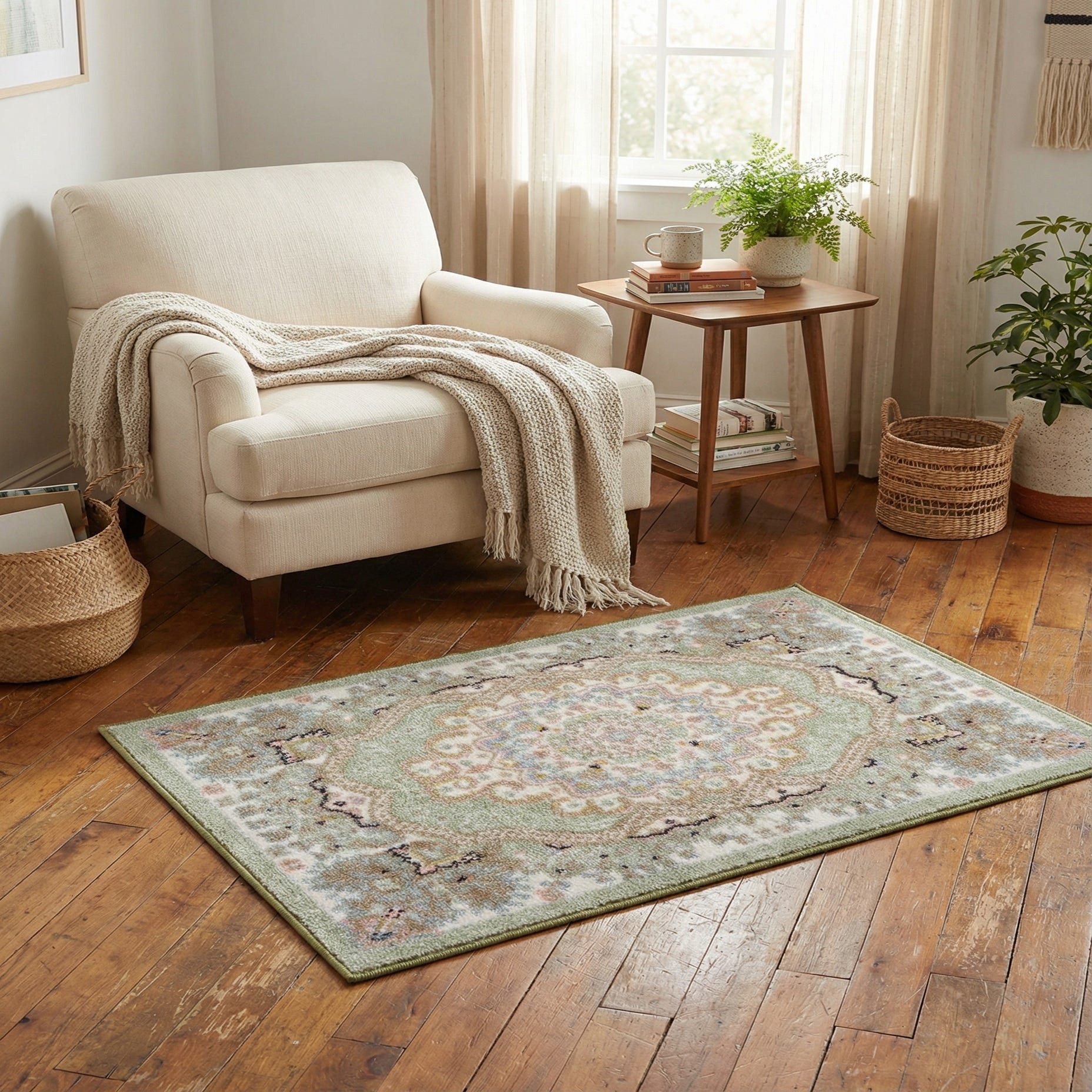 Primary color is Light Green. Colors in this rug include: Light Green, Beige, Ivory, Light Blue, Pink.