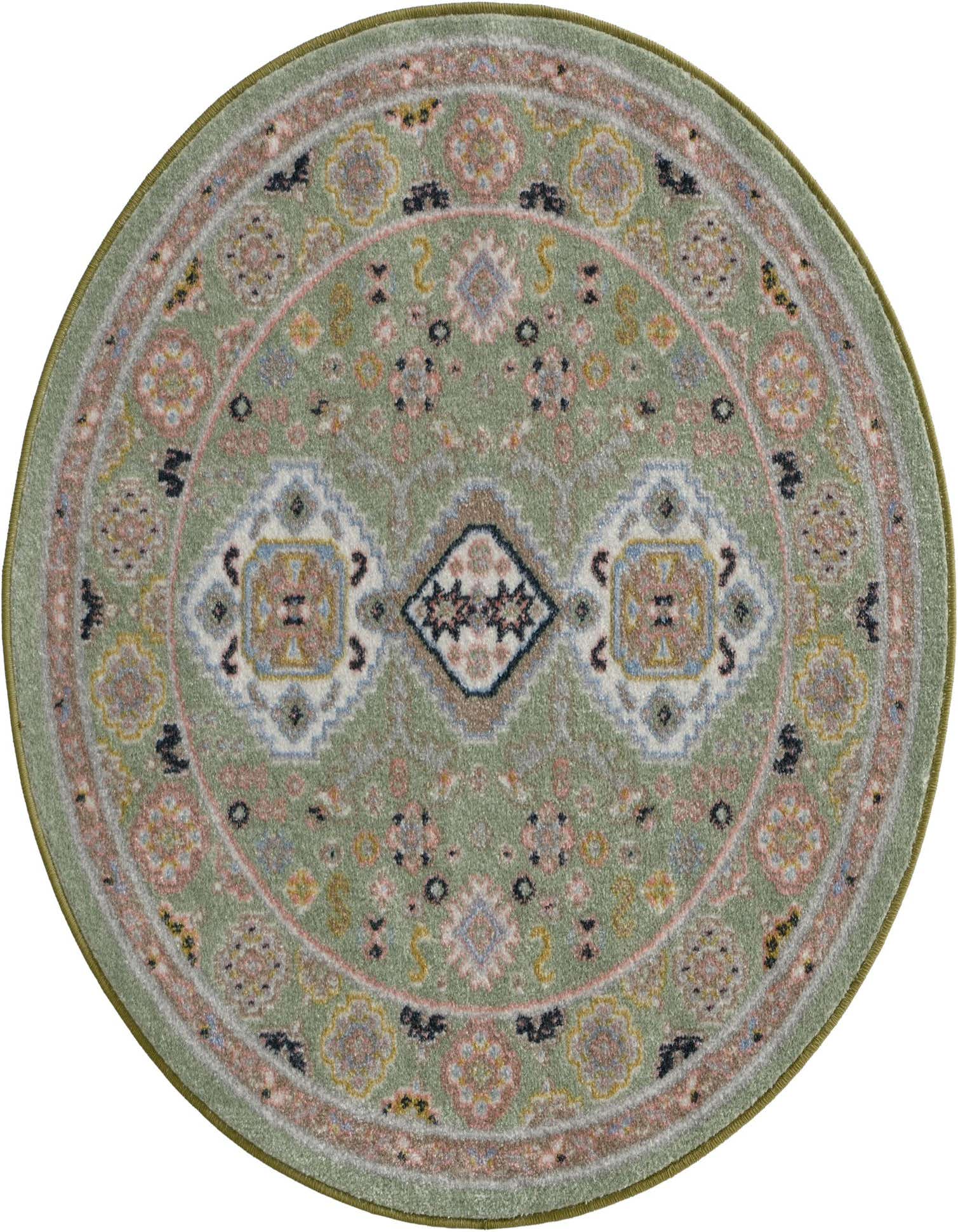 Primary color is Light Green. Colors in this rug include: Light Green, Black, Brown, Gray, Ivory, Pink, Yellow.