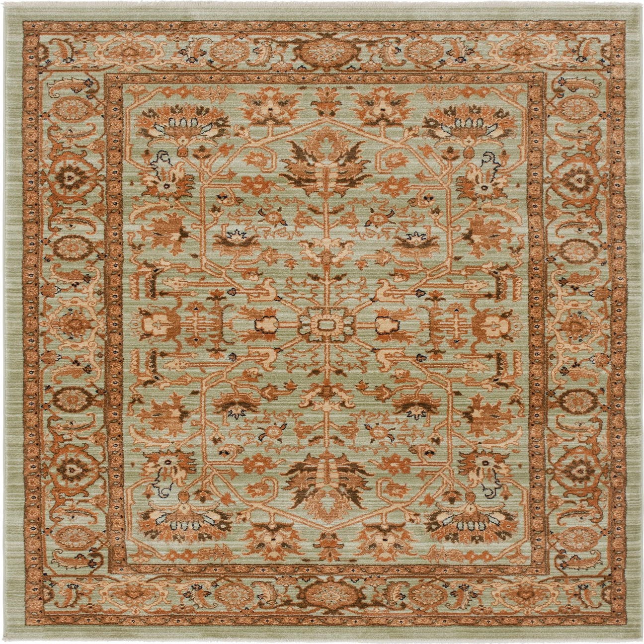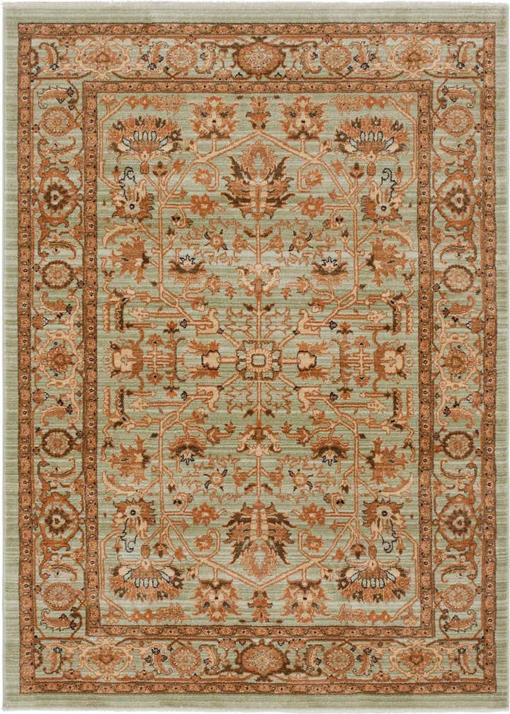 Primary color is Light Green. Colors in this rug include: Light Green, Burgundy, Orange, Tan, Navy Blue.