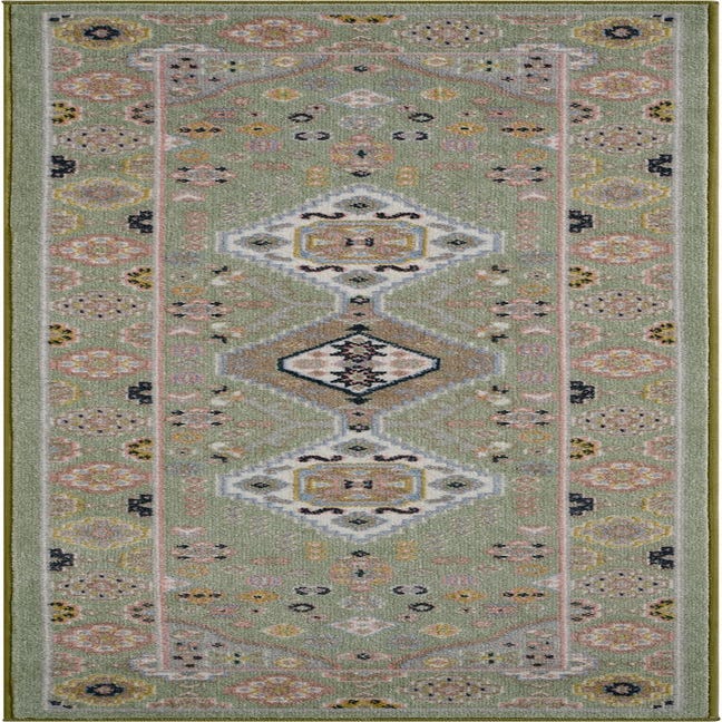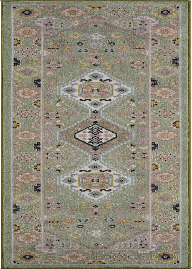 Primary color is Light Green. Colors in this rug include: Light Green, Beige, Black, Gray, Ivory, Pink, Light Blue.