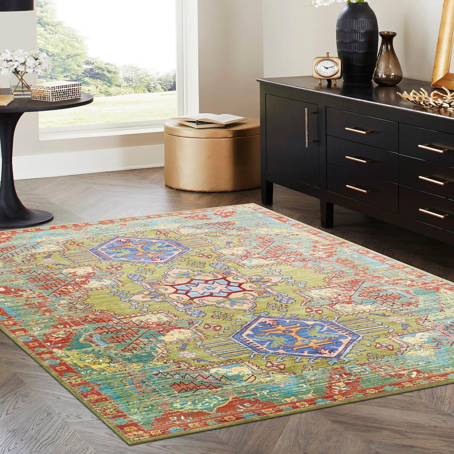 Primary color is Light Green. Colors in this rug include: Light Green, Beige, Blue, Navy Blue, Peach, Red, Tan, Puce.