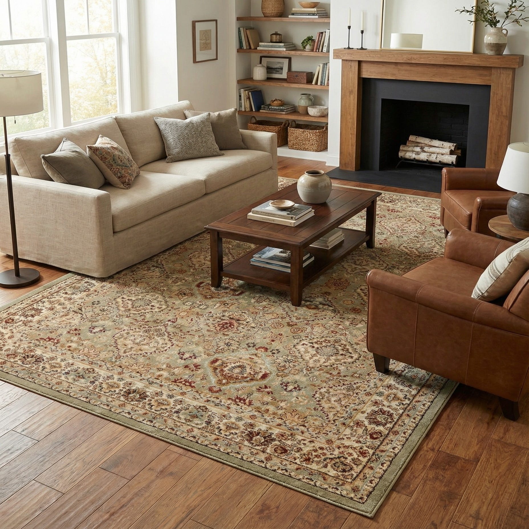 Primary color is Light Green. Colors in this rug include: Light Green, Cream, Light Blue, Red, Rust Red, Tan, Brown.