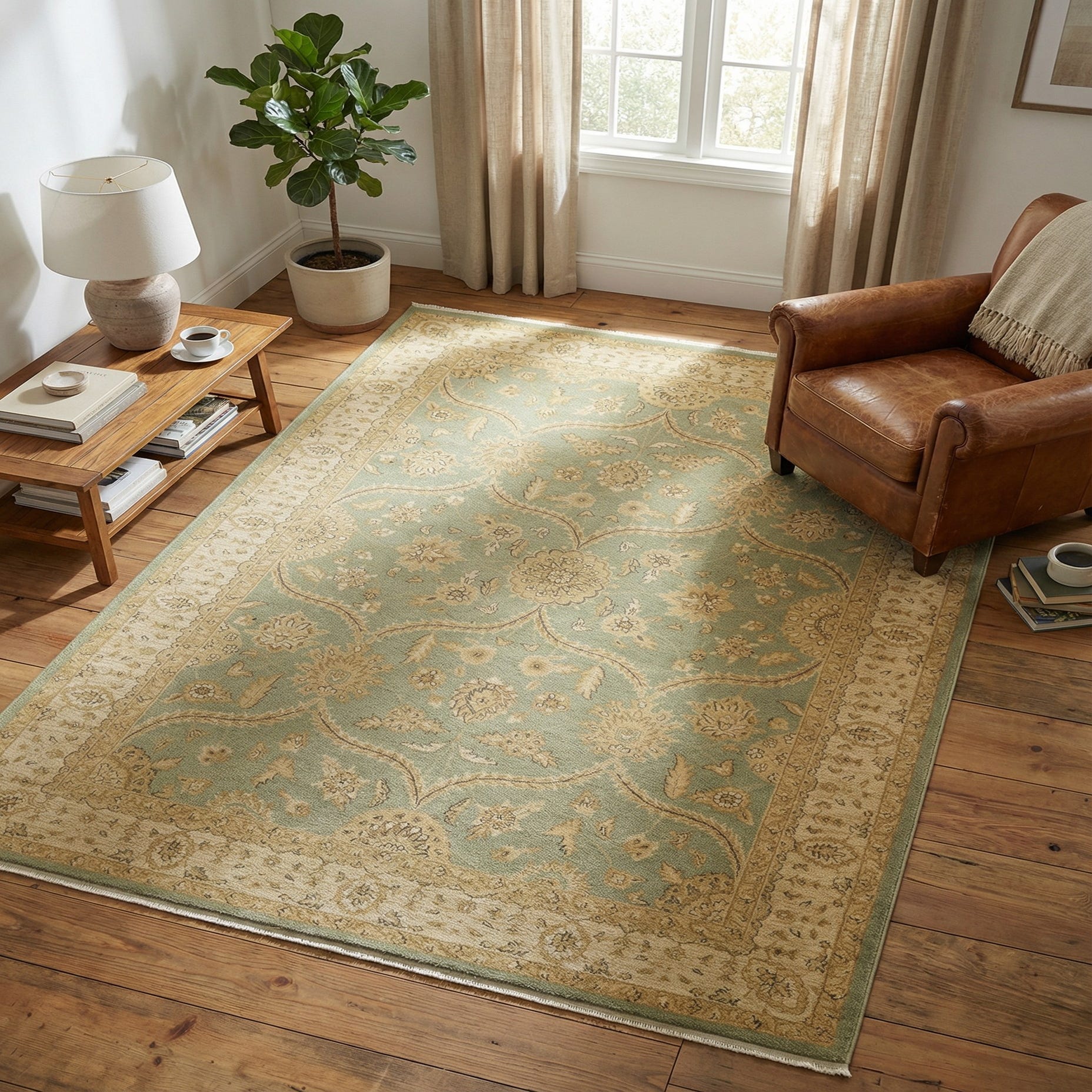 Primary color is Light Green. Colors in this rug include: Light Green, Cream, Beige, Brown.