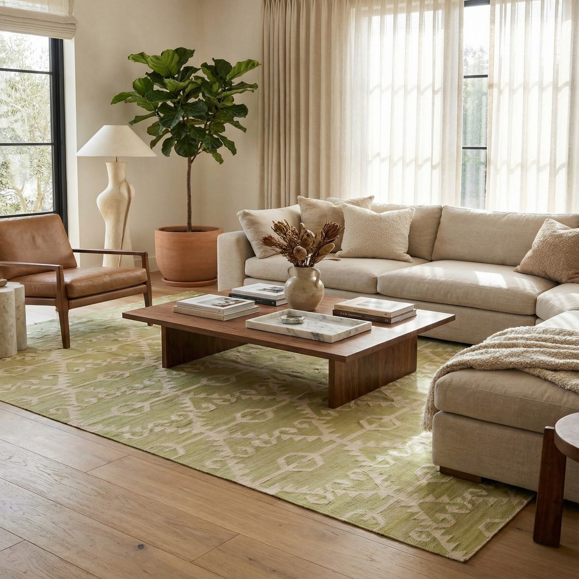Primary color is Light Green. Colors in this rug include: Light Green, Beige.