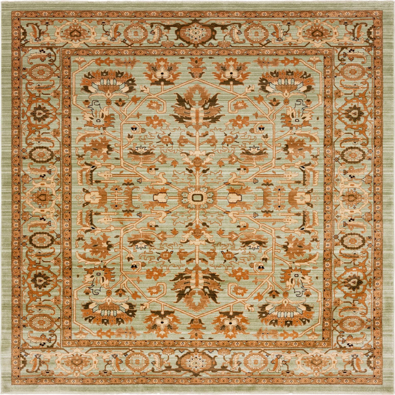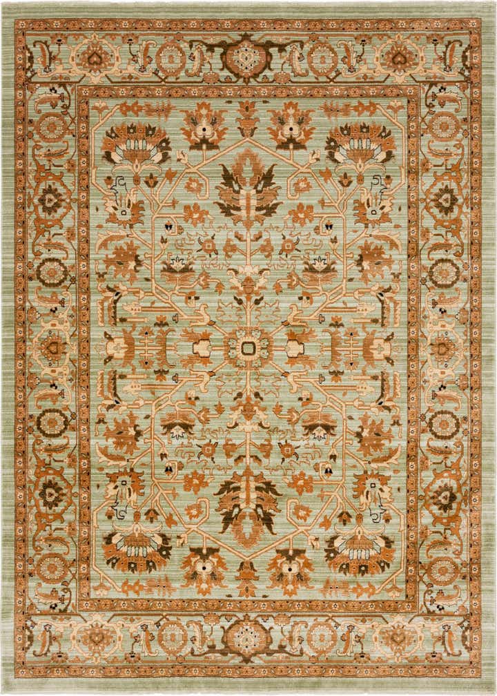 Primary color is Light Green. Colors in this rug include: Light Green, Burgundy, Orange, Tan, Navy Blue.