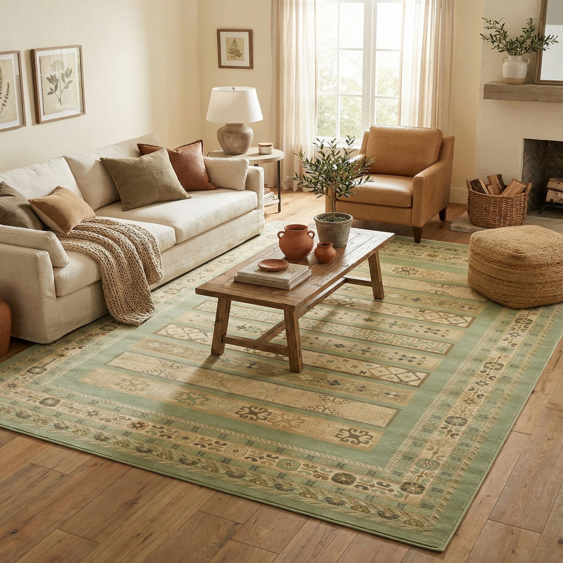 Primary color is Light Green. Colors in this rug include: Light Green, Cream, Light Brown, Olive, Tan, Brown.
