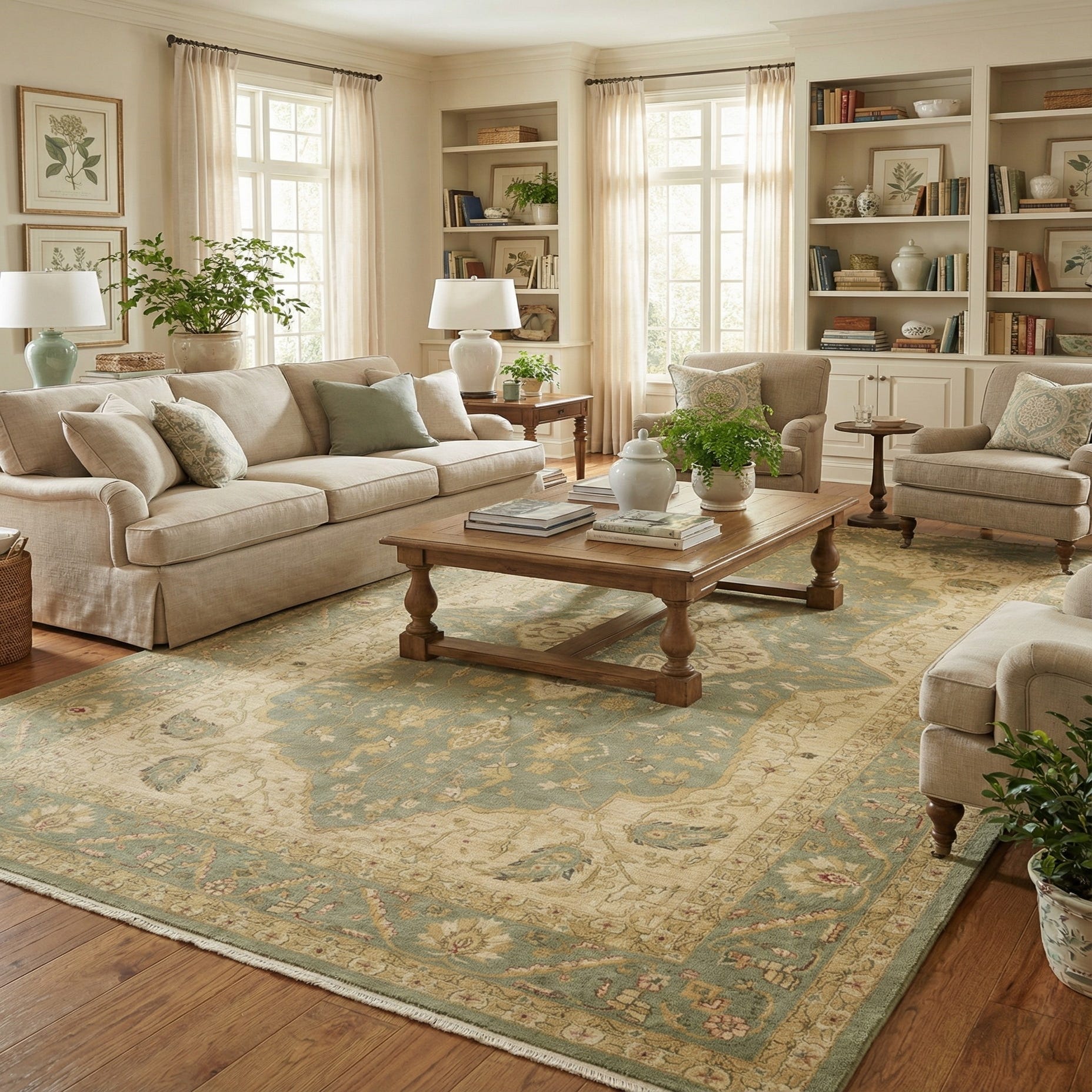 Primary color is Light Green. Colors in this rug include: Light Green, Cream, Beige, Red, Light Brown.