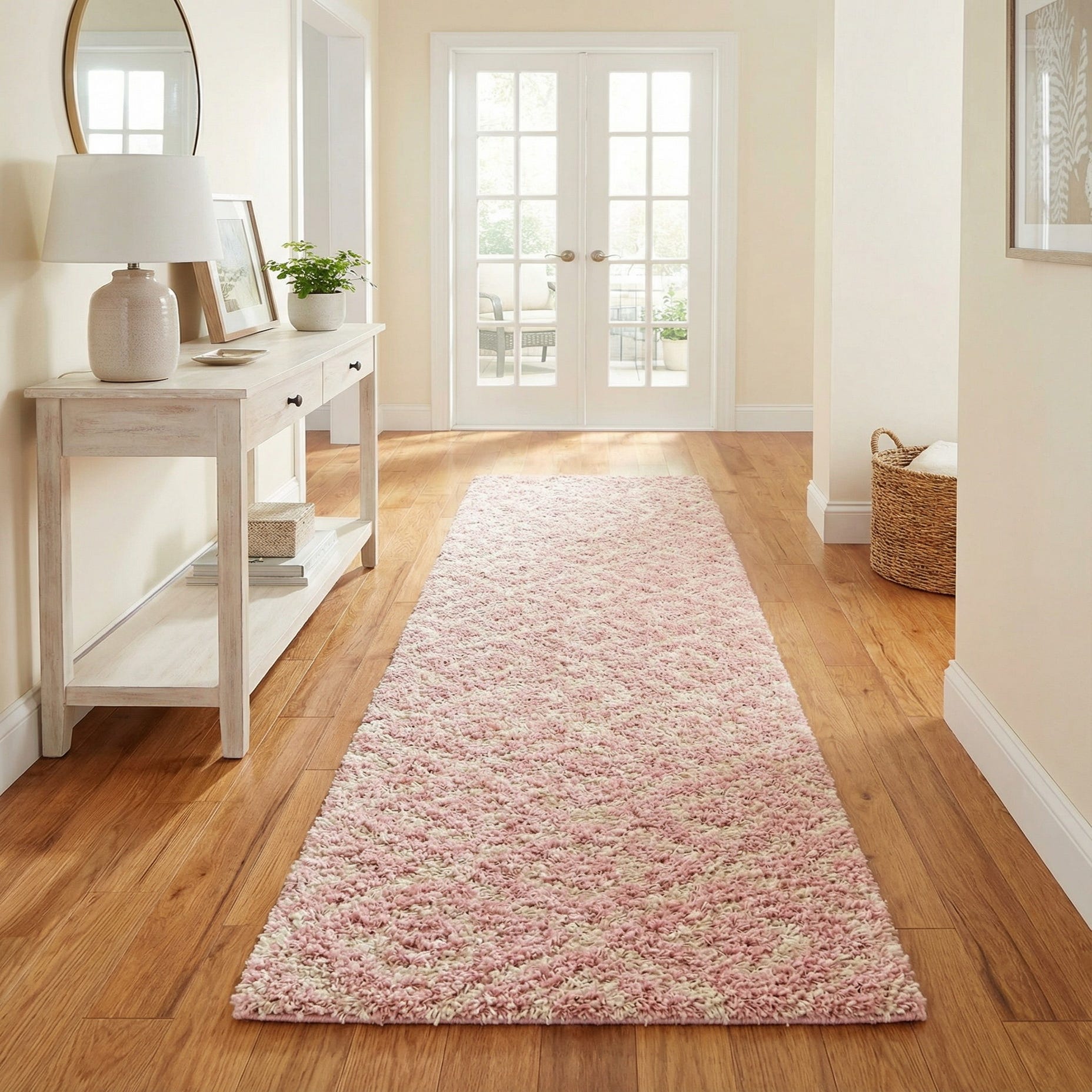 Primary color is Light Pink. Colors in this rug include: Light Pink, Ivory.