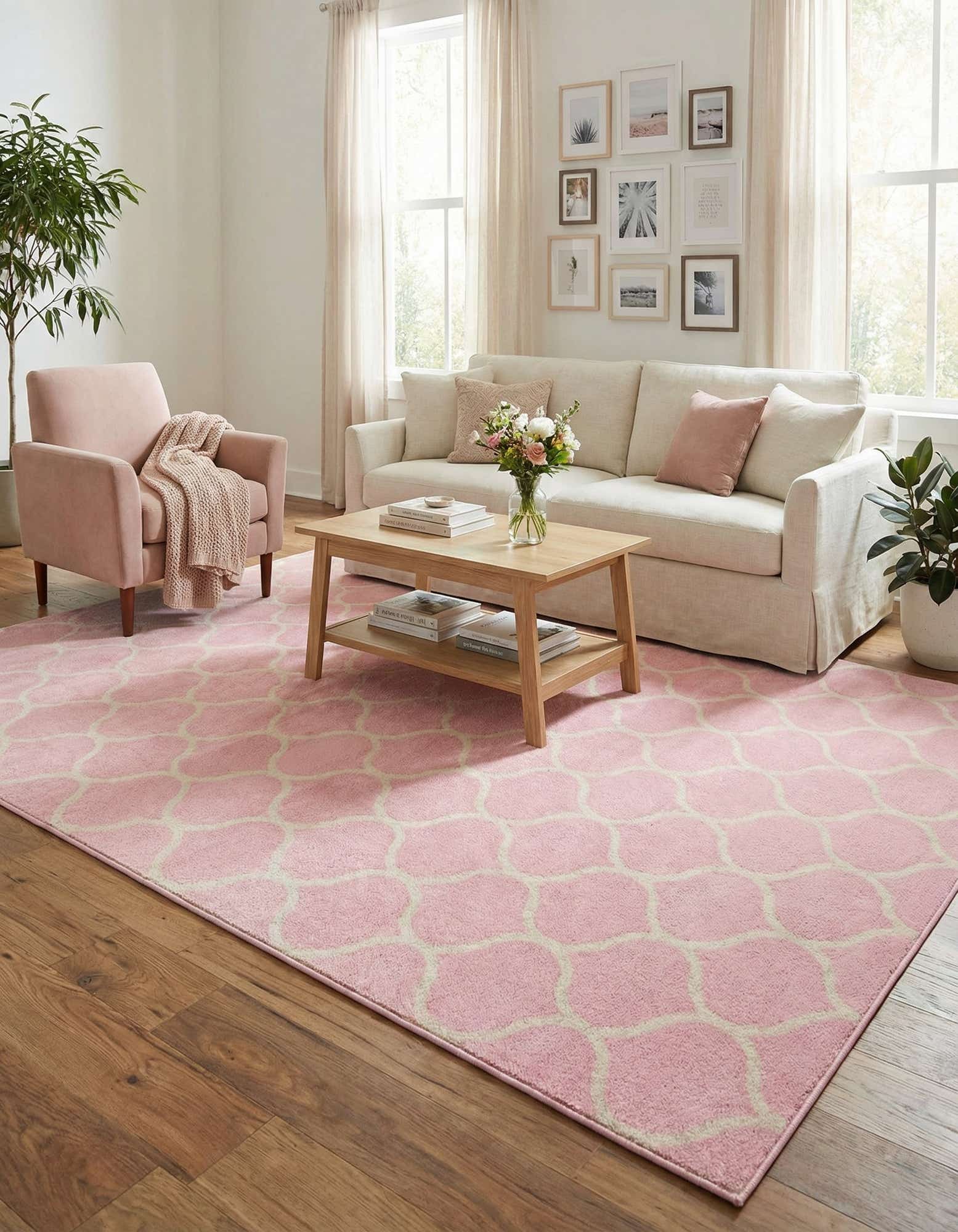 Primary color is Light Pink. Colors in this rug include: Light Pink, Ivory.