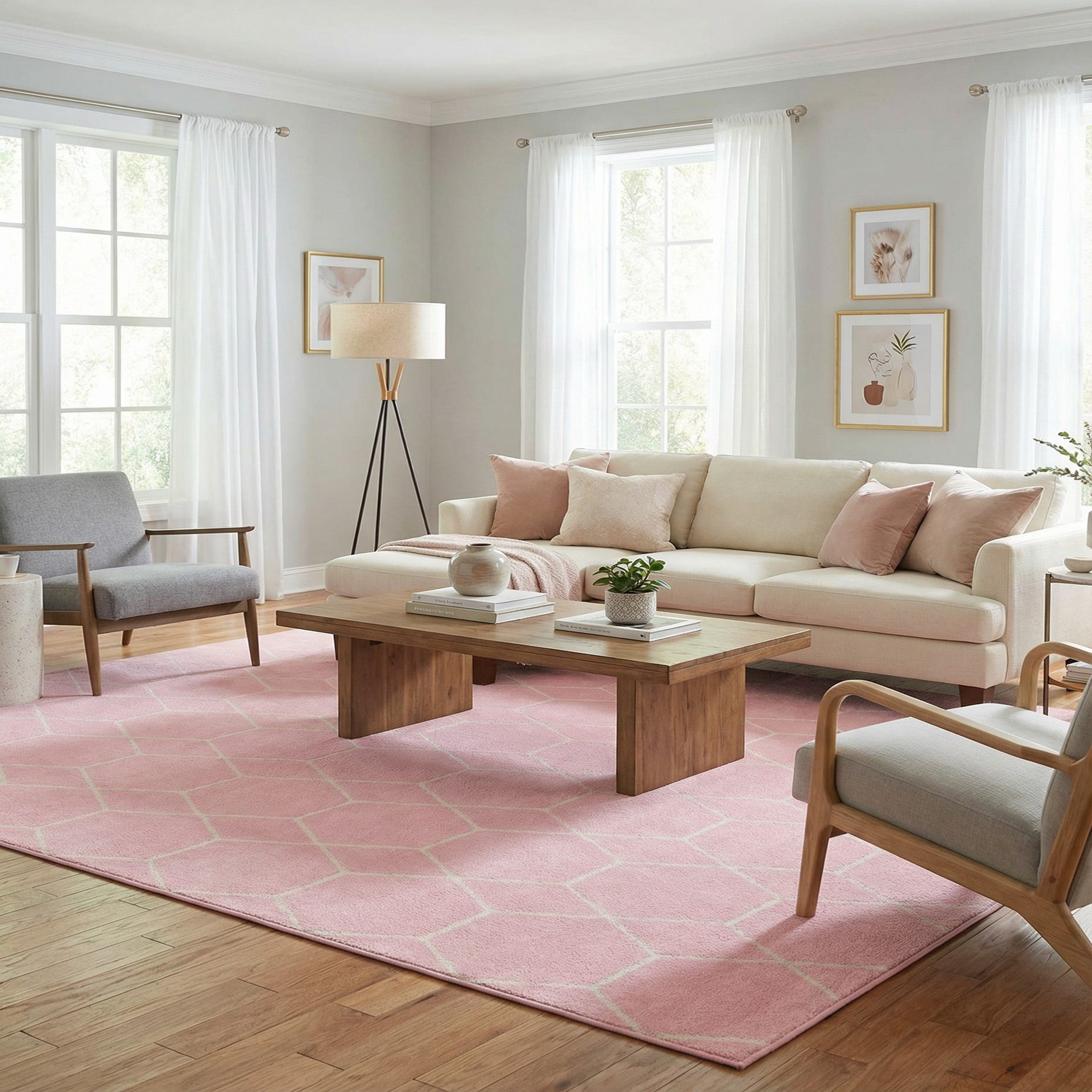 Primary color is Light Pink. Colors in this rug include: Light Pink, Ivory.