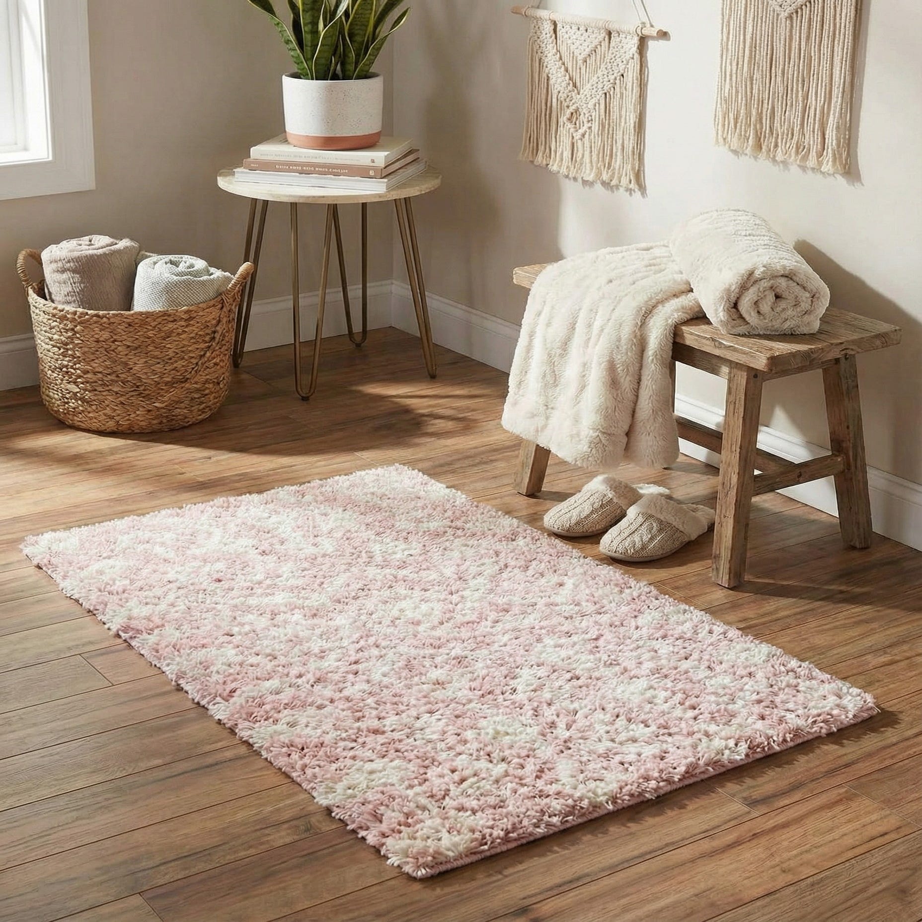Primary color is Light Pink. Colors in this rug include: Light Pink, Ivory.