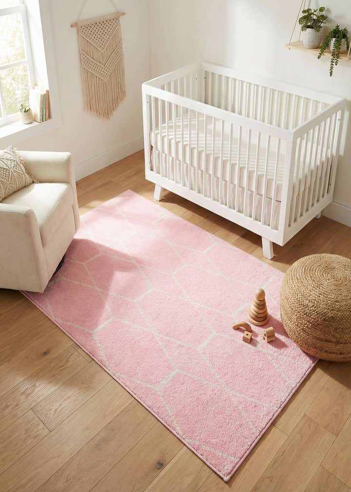 Primary color is Light Pink. Colors in this rug include: Light Pink, Ivory.