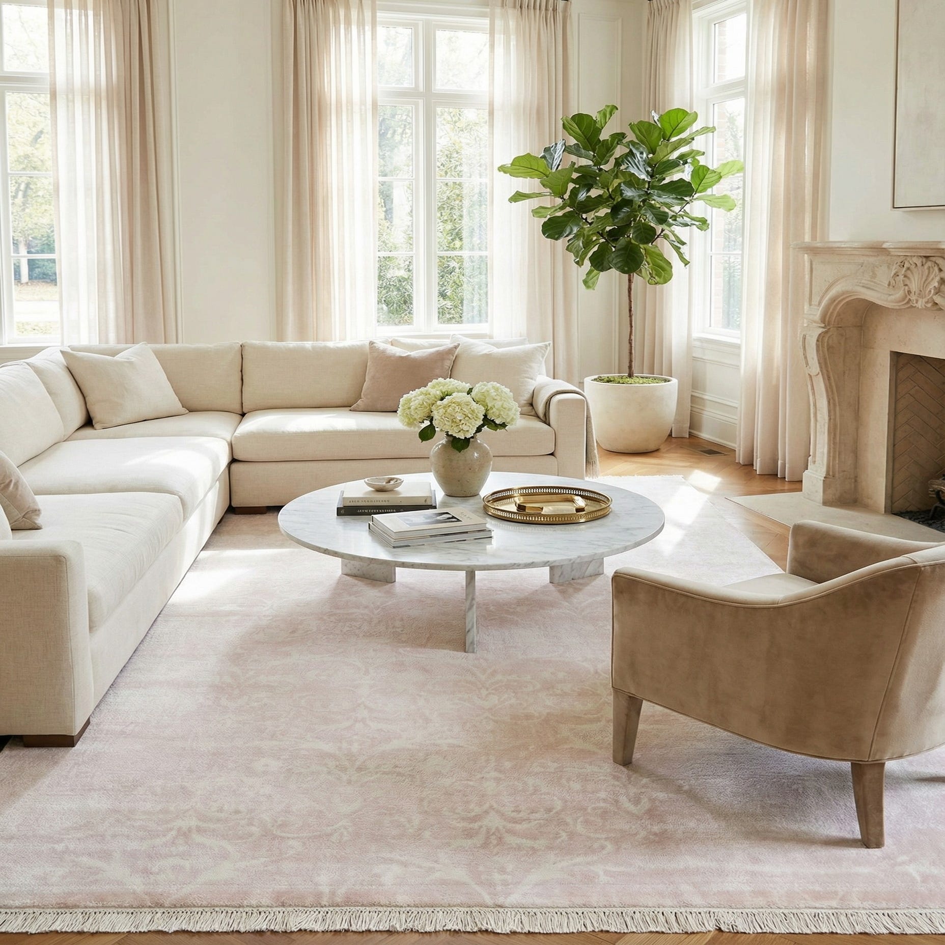 Primary color is Light Pink. Colors in this rug include: Light Pink, Beige, Puce.