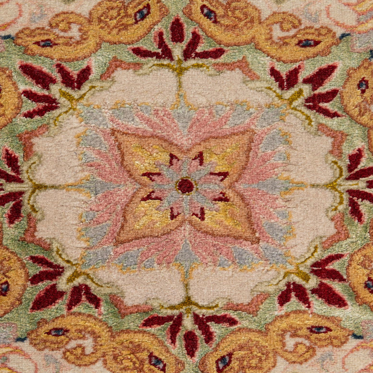 Primary color is Light Pink. Colors in this rug include: Light Pink, Brown, Cream, Green, Ivory, Red, Yellow.