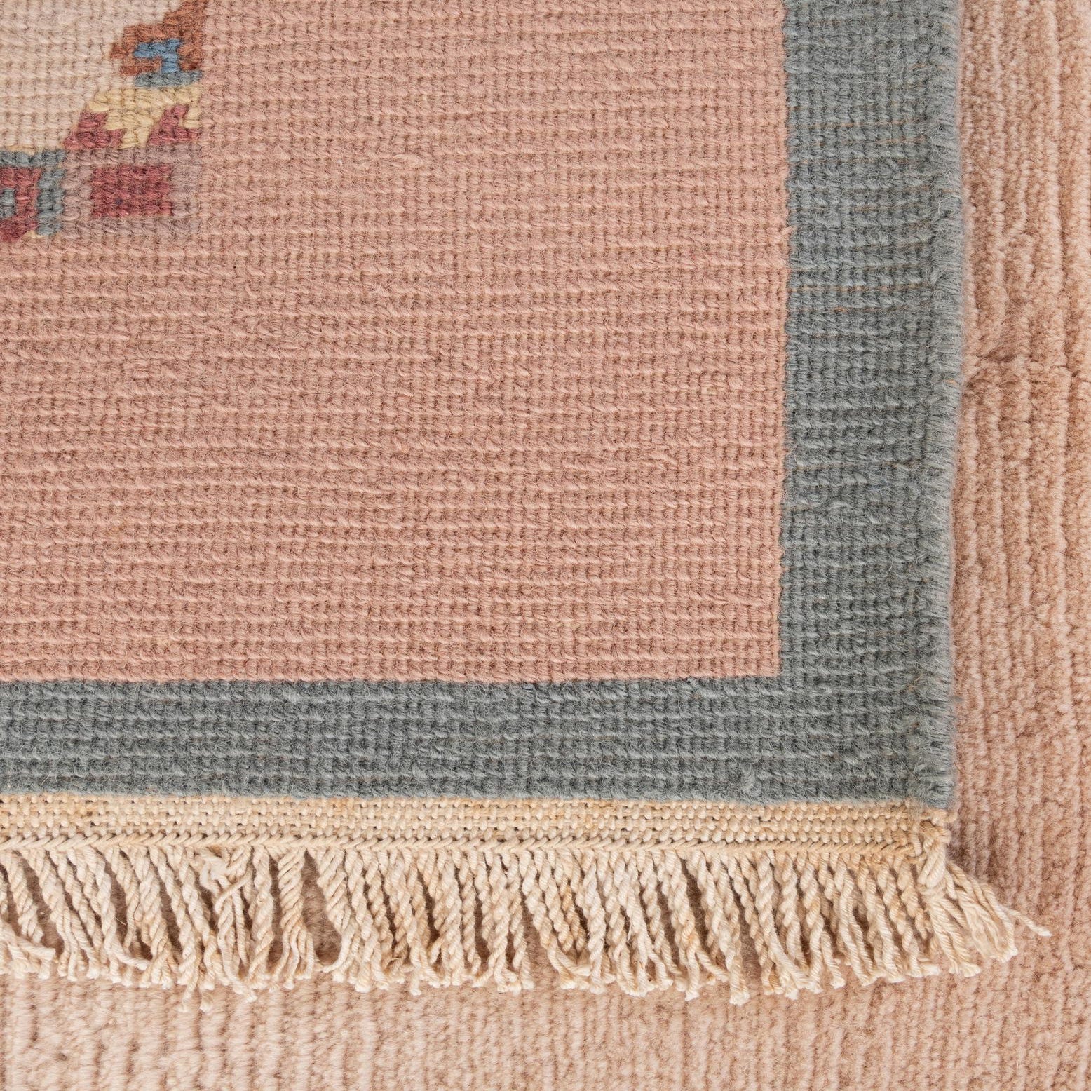 Primary color is Light Pink. Colors in this rug include: Light Pink, Blue, Gray, Pink, Yellow, Brown, Red.