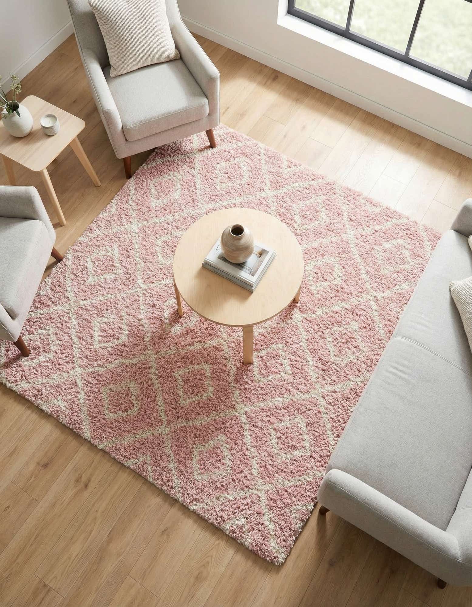 Primary color is Light Pink. Colors in this rug include: Light Pink, Ivory.